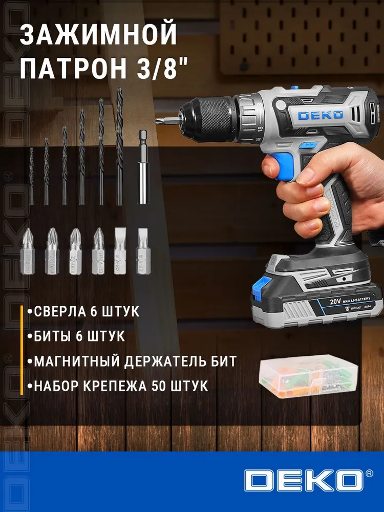 Дрель-шуруповерт аккумуляторная DEKO DKCD20V PRO в кейсе + набор 63 инструмента, 20В, 2x2.0Ач