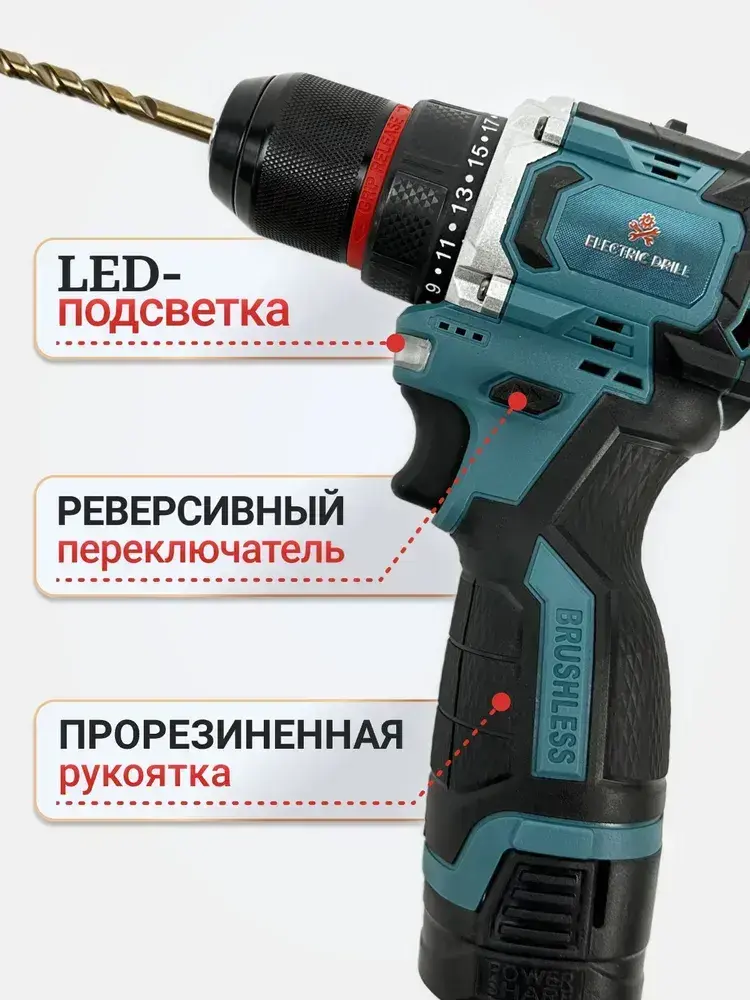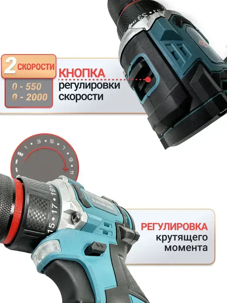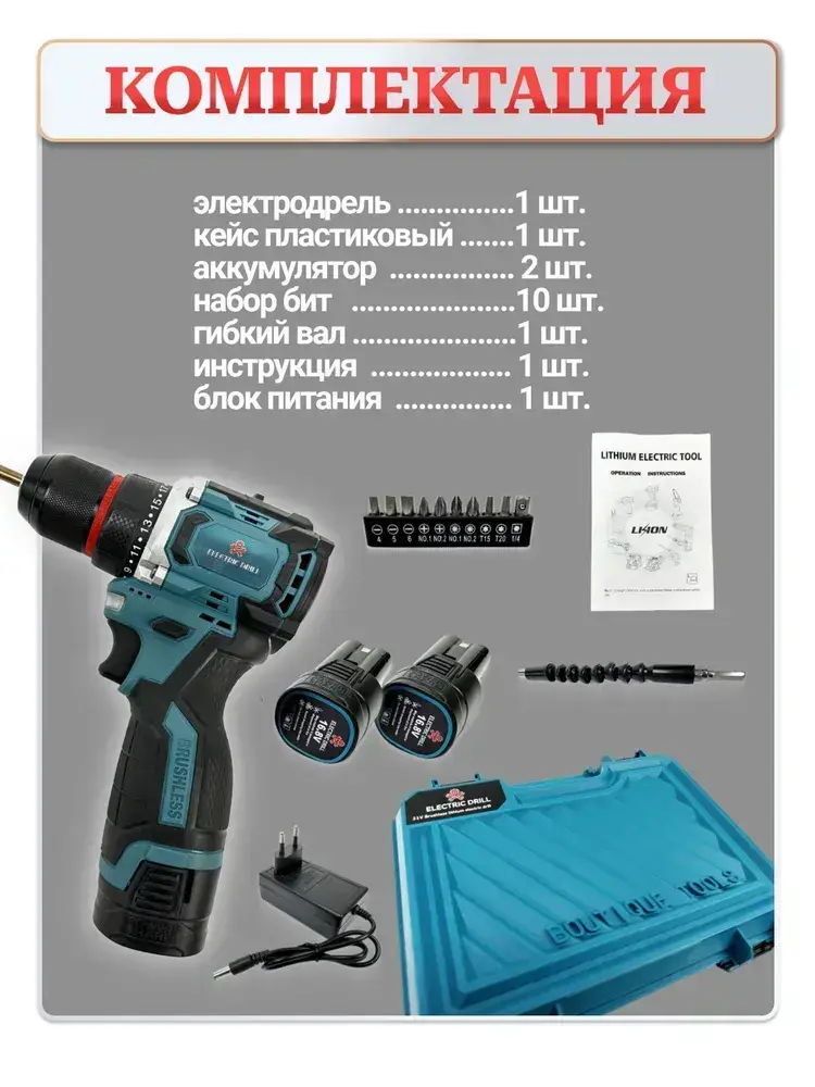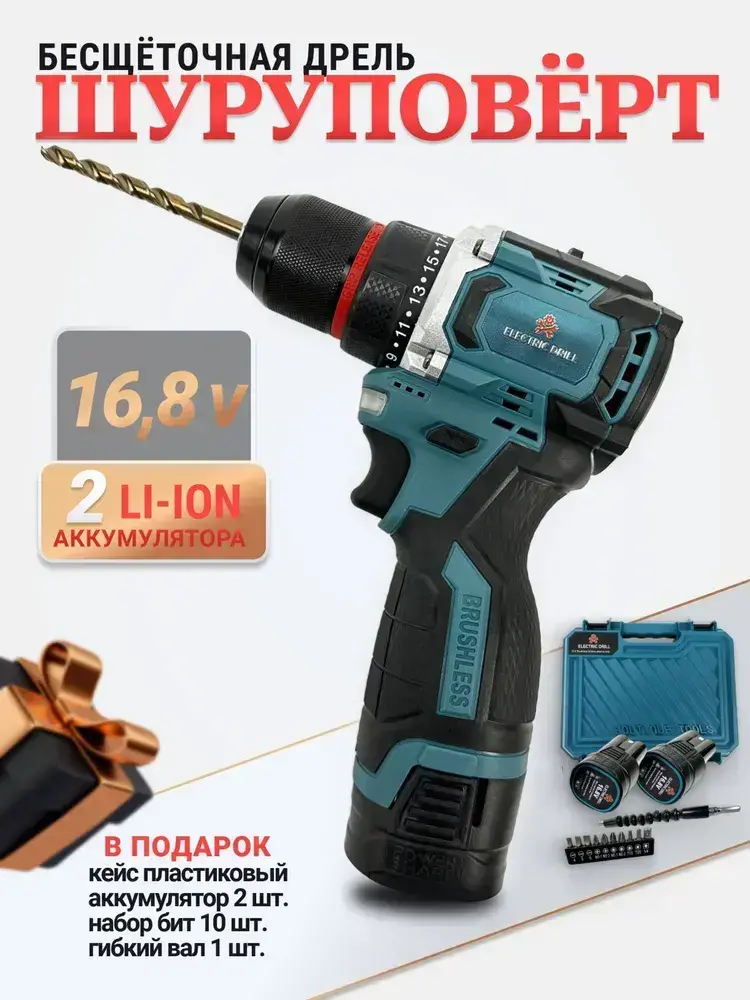 Дрель-шуруповерт аккумуляторная дрель ручная с 2 скоростями 16.8В,2 АКБ Li-ion, 42 Нм, 2000 об/мин, кейс + набор оснастки