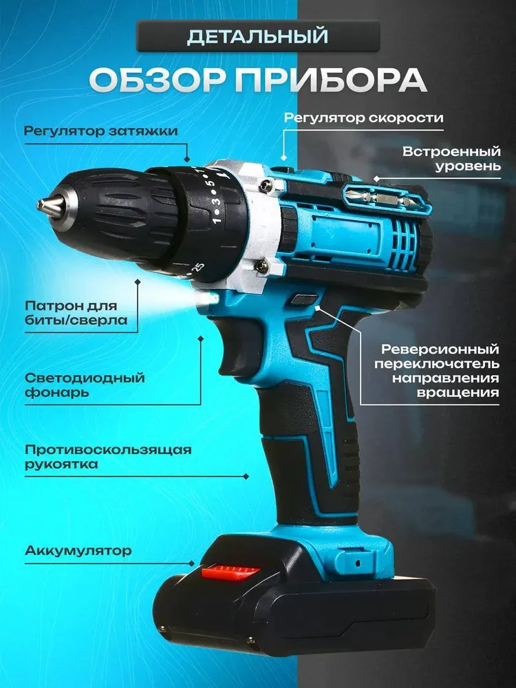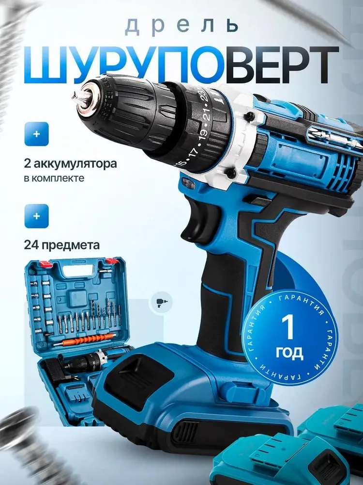 Дрель шуруповерт аккумуляторная / Набор бит и сверл / 2 АКБ