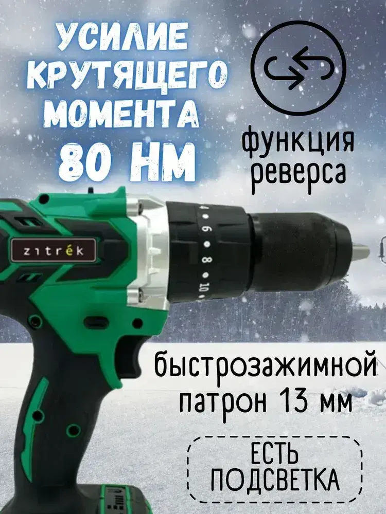 Дрель-шуруповерт аккумуляторная ударная Zitrek Green Impact 18V для рыбалки (18В, Li-ion 2x4.0Ач) рыбацкий ледобур ЗИТРЕК