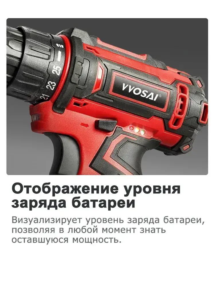 Дрель-шуруповерт аккумуляторная VVOSAI WS-3016-A2-SXP, 16В 36Нм, 2xLi-ion, ЗУ, аксессуары 24 штук, кейс для хранения