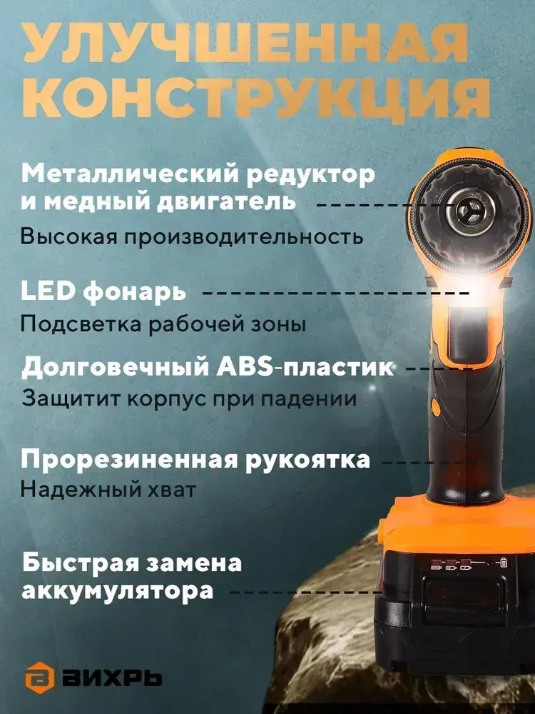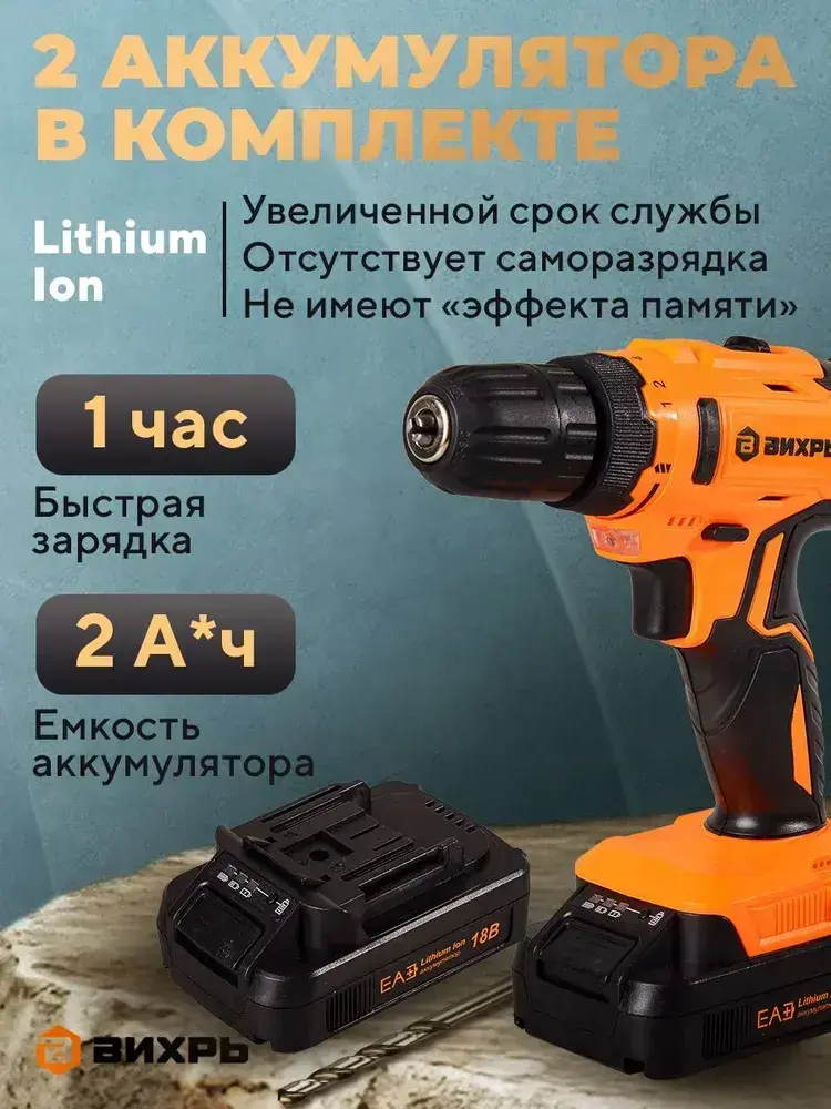 Дрель-шуруповерт аккумуляторный 18В в кейсе ДА-1822Б Вихрь / 2 АКБ в комплекте