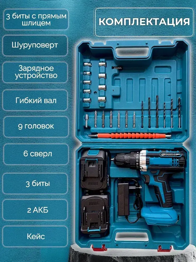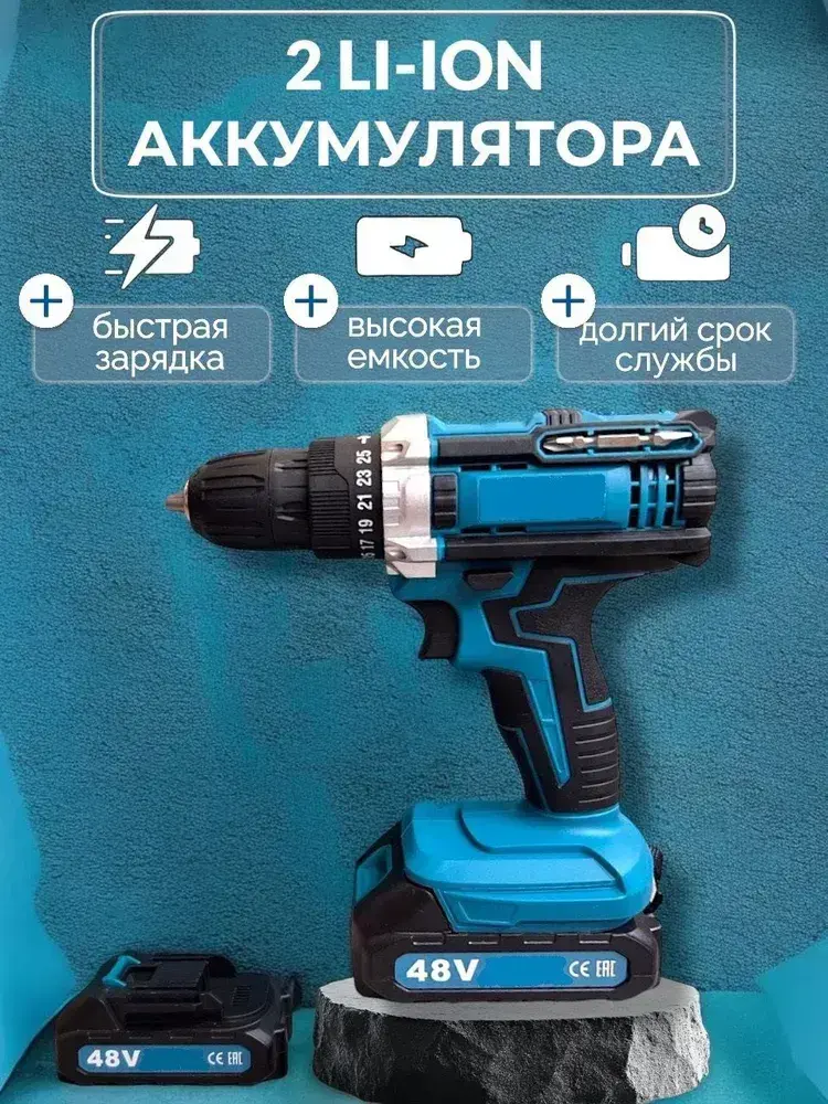Дрель - Шуруповерт, аккумуляторный, 48V / 48В, 2 АКБ Li-ion, Шуруповерт с набором, 2 скорости