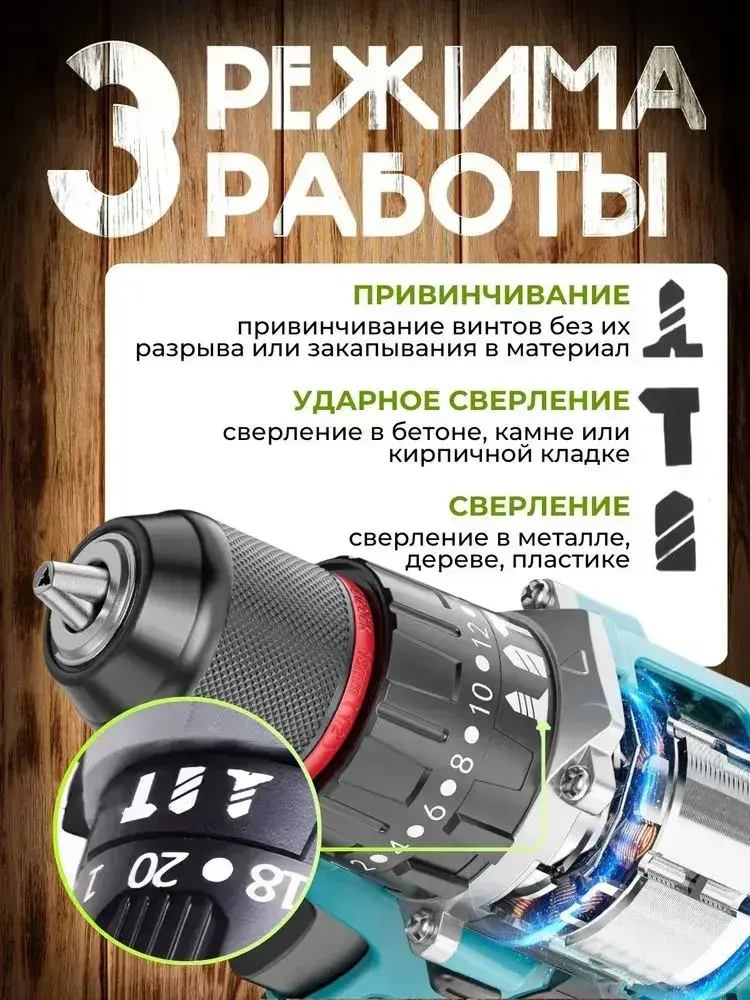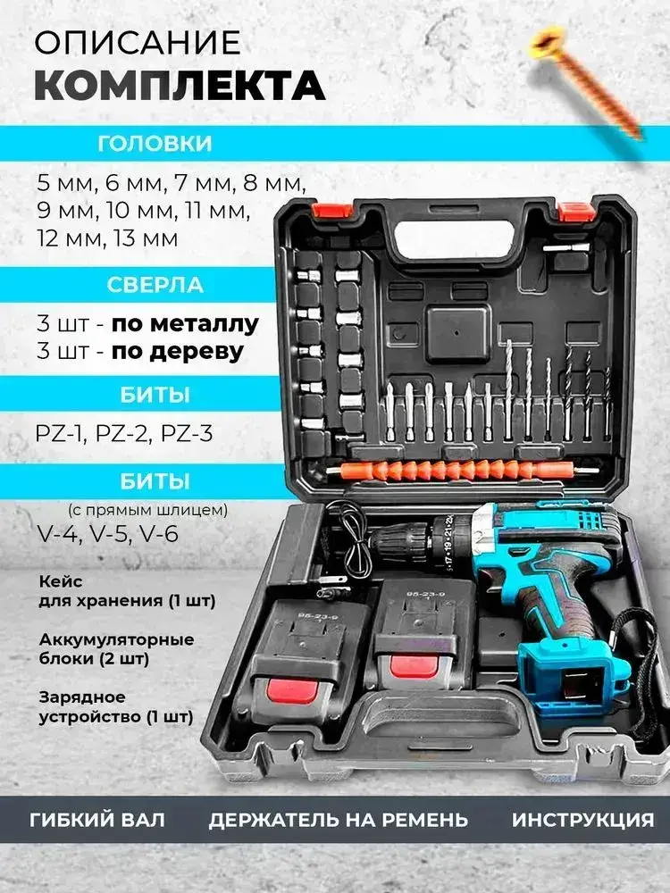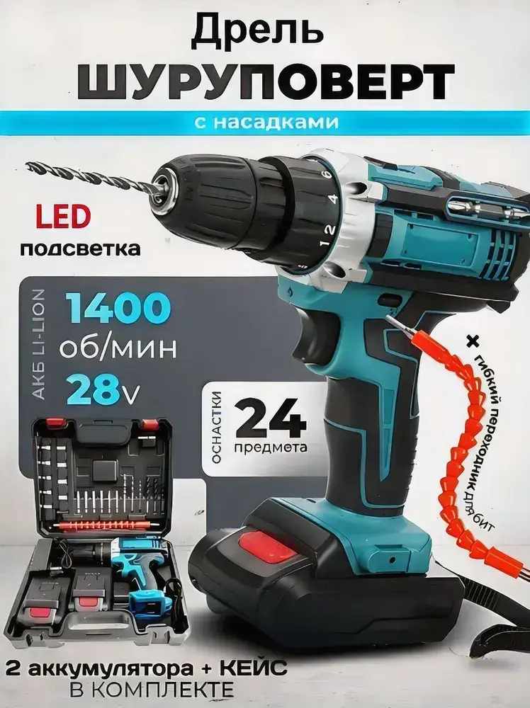 Дрель шуруповерт аккумуляторный бесщеточный электрический, 24В, 24 насадки и зарядная станция в наборе
