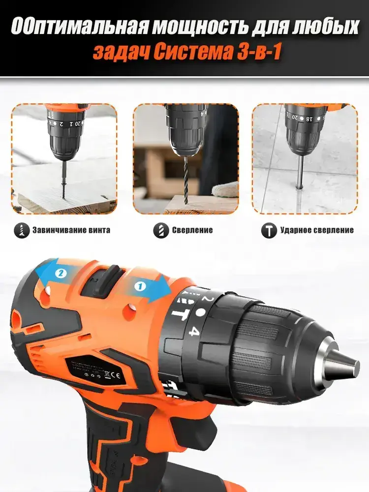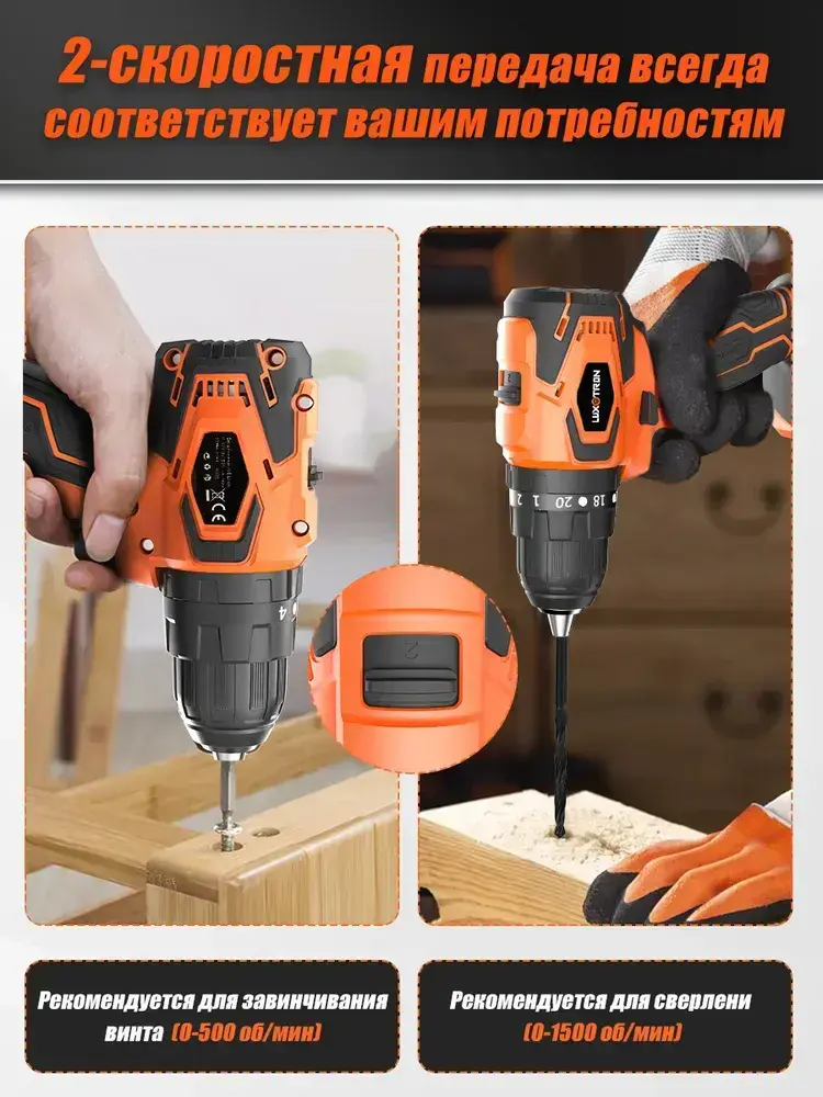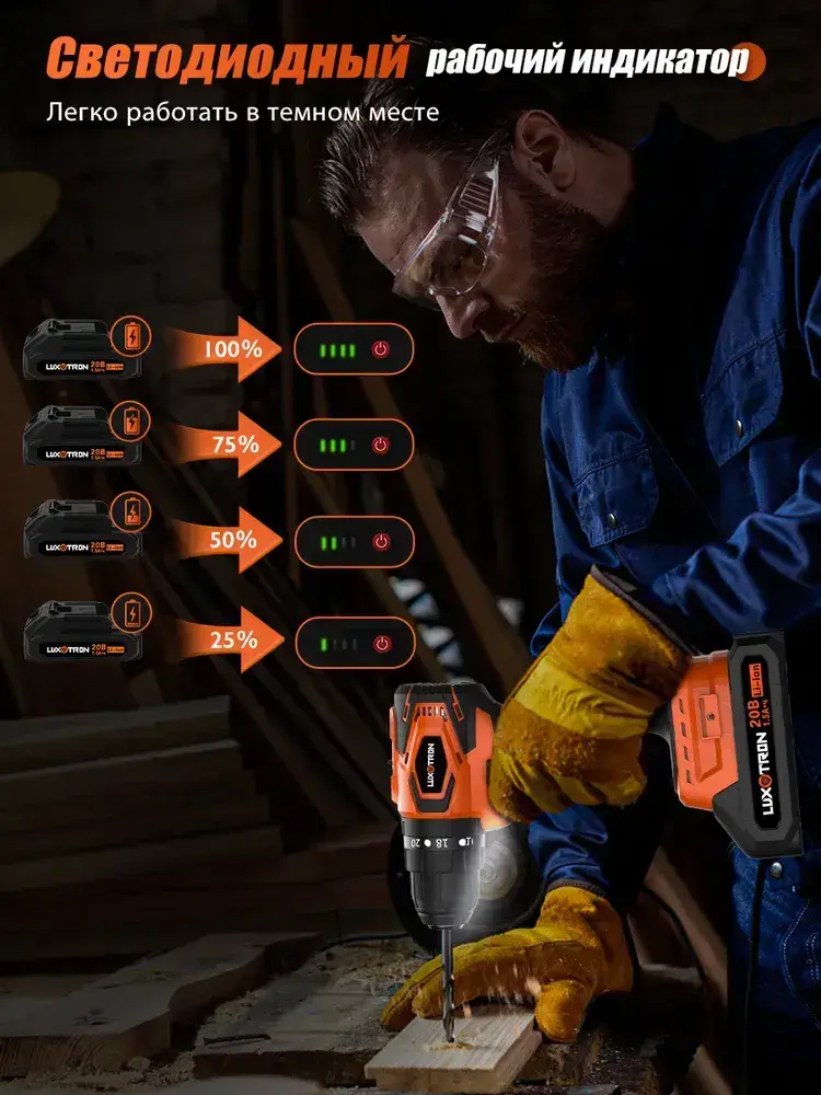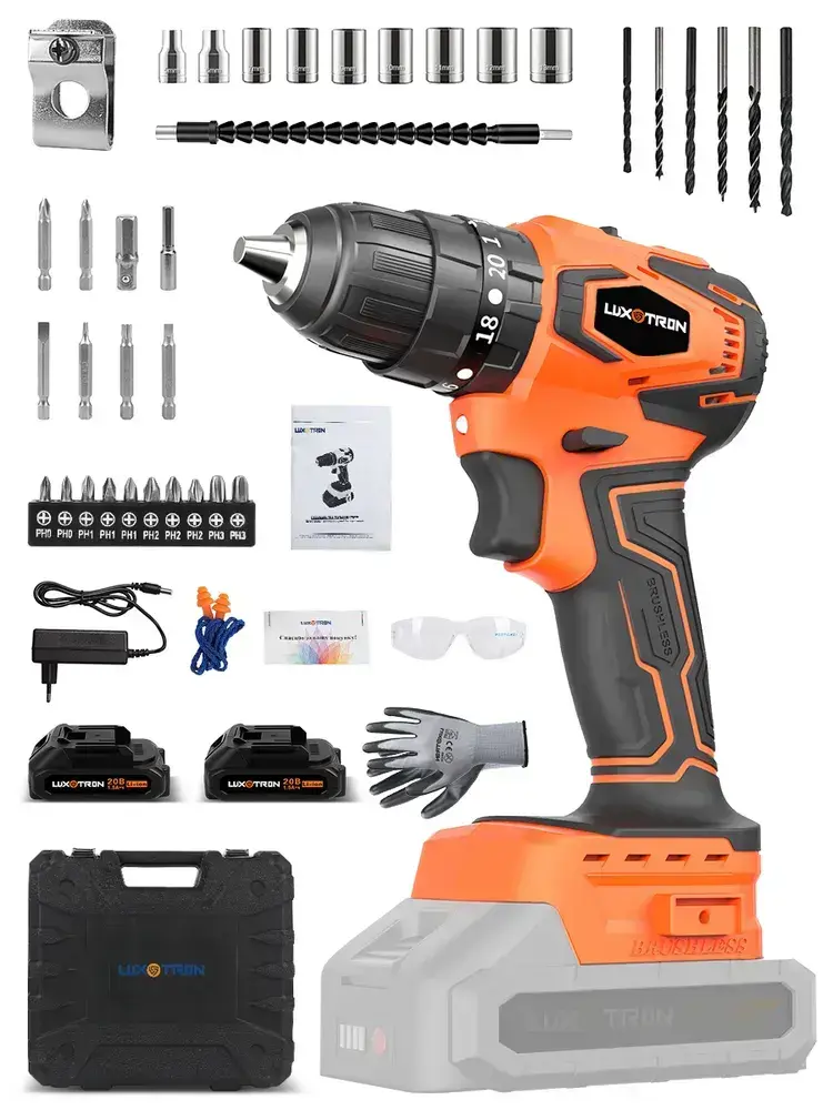 Дрель-шуруповерт аккумуляторный бесщеточный Luxotron, 20 В, крутящий момент 20+3, максимальное усилие 50 Н.м, 2 аккумулятора и светодиодная рабочая подвестка