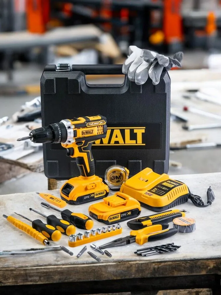 Дрель - Шуруповерт аккумуляторный DeWalt 21v, 2.0 А*ч / Кейс с набором инструментов, бит, свёрл, головок 30 предмета / Многофункциональный для сверления, закручивания , ударный 2 АКБ.
