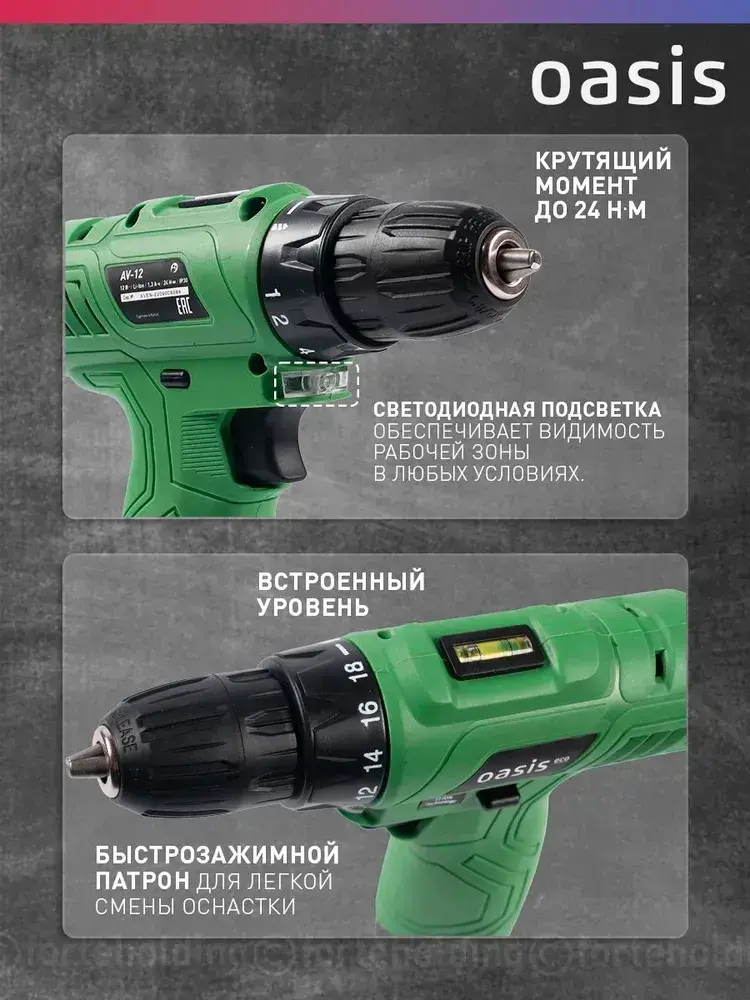 Дрель-шуруповерт аккумуляторный Oasis AV-12 Eco, 12 В, 24Нм, реверс, фонарик