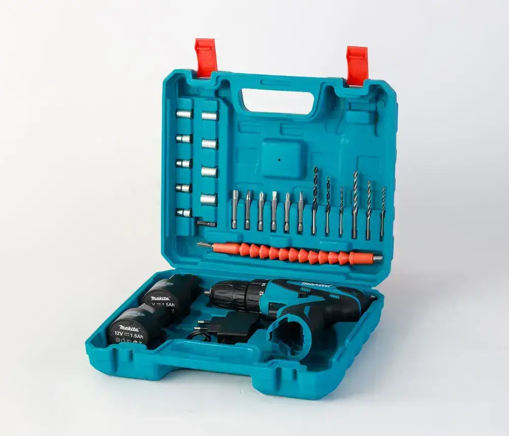 Дрель-Шуруповерт Makita Шуруповерт аккумуляторный 12V, аккумуляторный, Макита 12В, 2 АКБ / Кейс с набором бит, свёрел и головок / шуруповерт с набором инструментов
