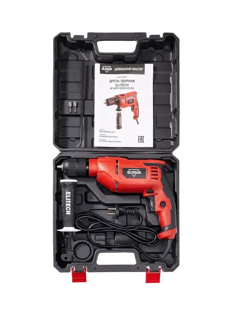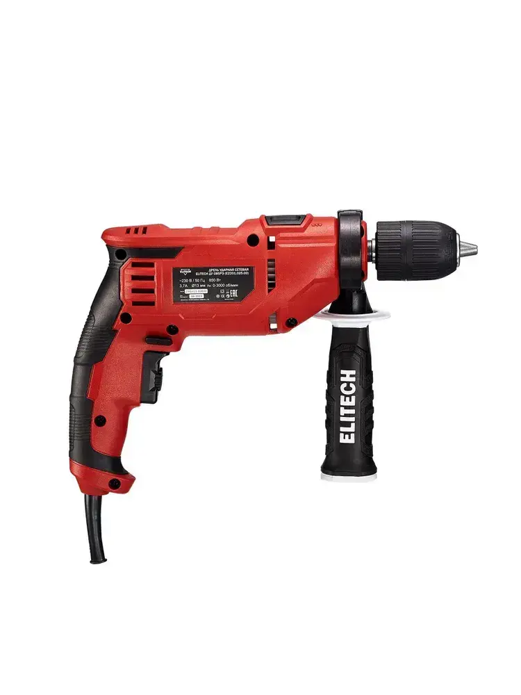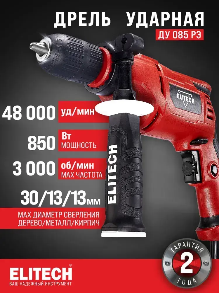 Дрель ударная сетевая Elitech ДУ 085РЭ, 850 Вт, 50 Нм, 3 000 об/мин, 48 000 уд/мин, ключевой патрон, реверс