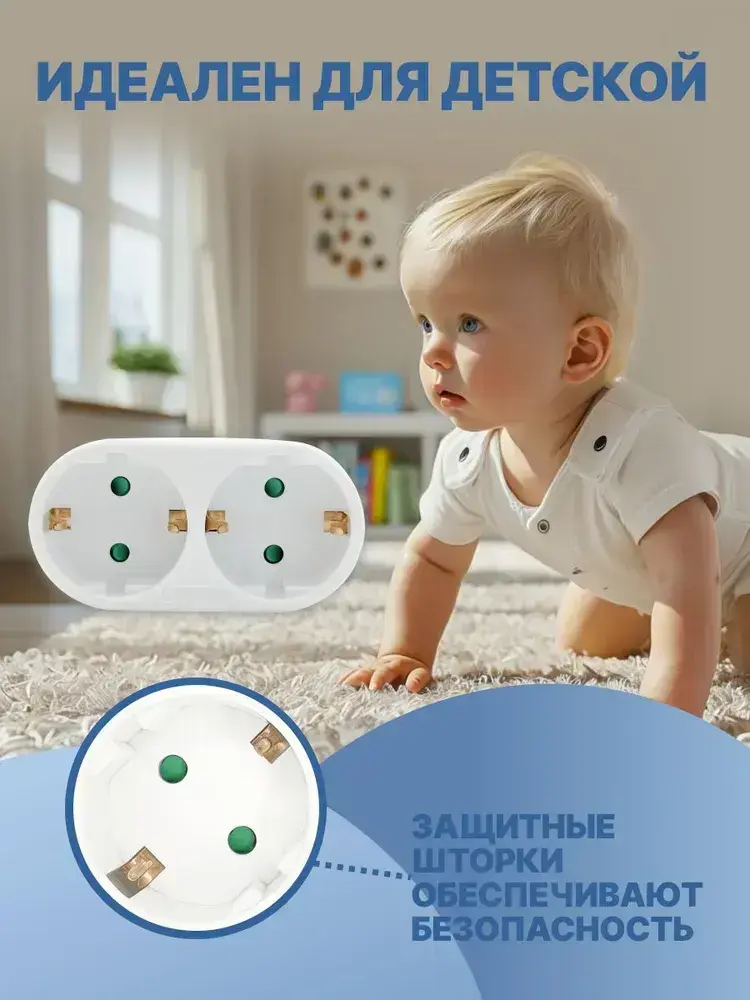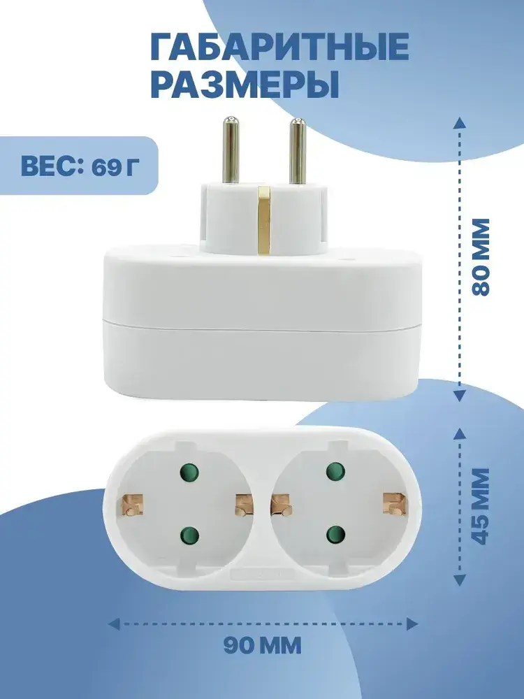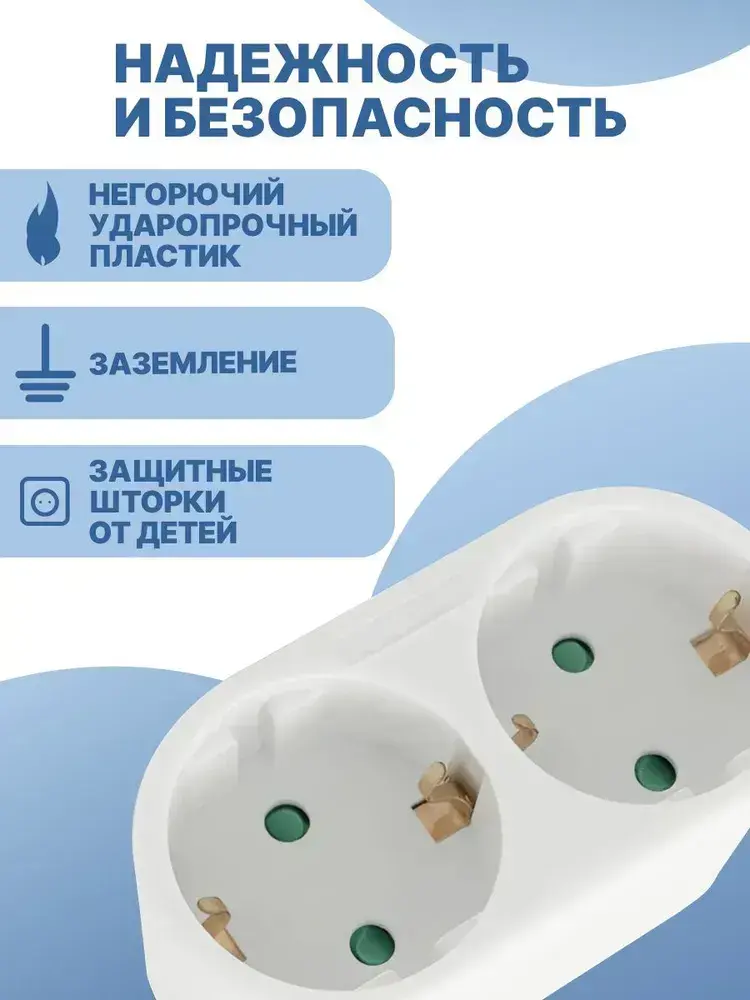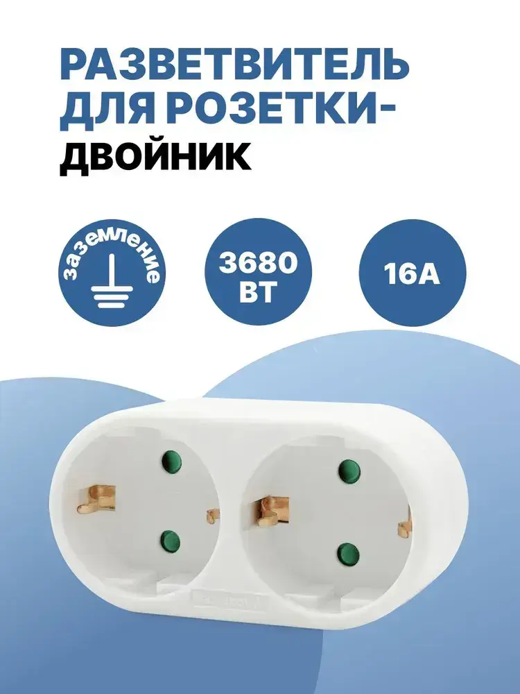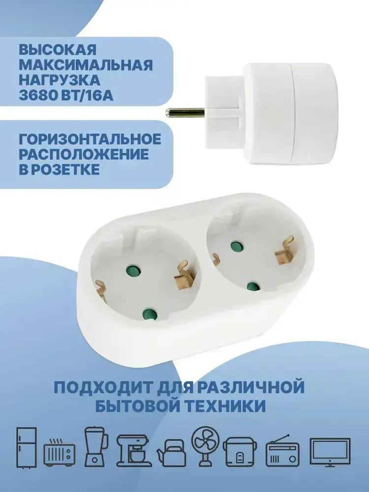 Двойник для розетки электрический 16А с заземлением, разветвитель тройник сетевой белый
