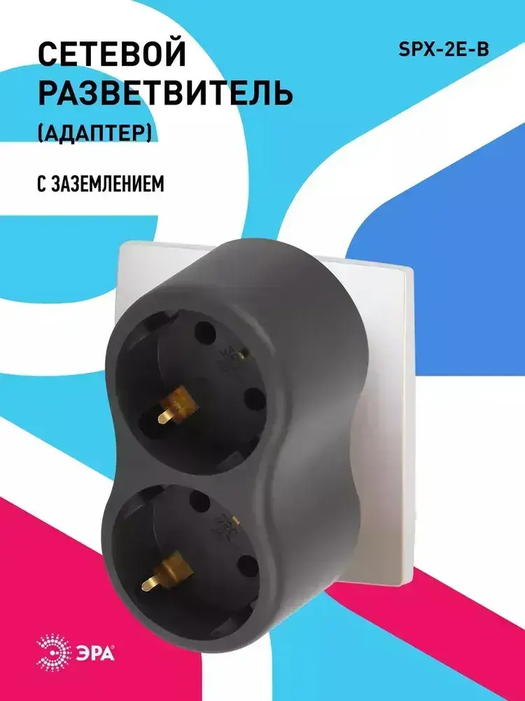 Двойник для розетки электрический ЭРА SPx-2e-B с заземлением, 16А, черный / Разветвитель электрический 2 розетки, тройник