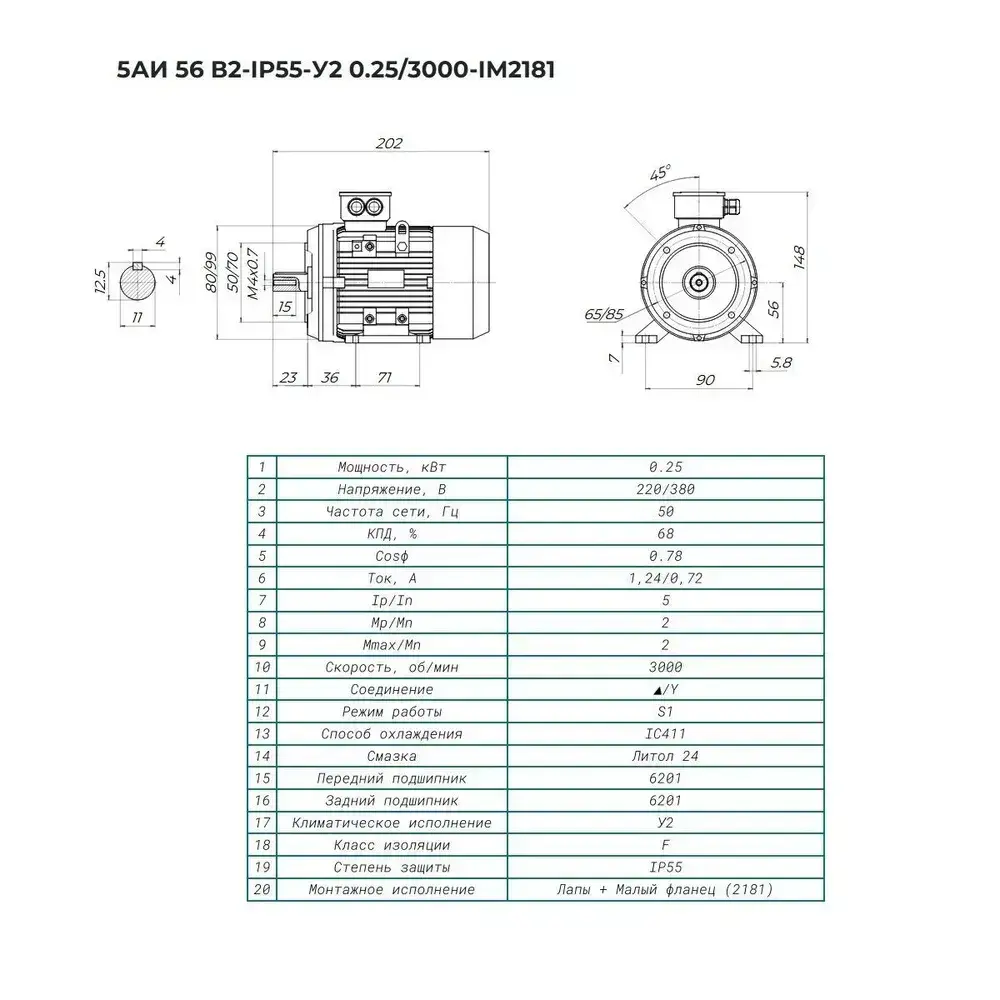 Электродвигатель трехфазный 5АИ 56 В2 FT85 IM 2181 0.25 кВт 3000 об мин