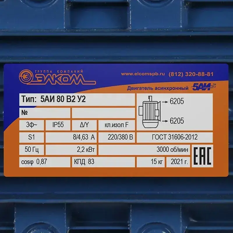 Электродвигатель трехфазный 5АИ 80 В2 IM 2081 2.2 кВт 3000 об/мин