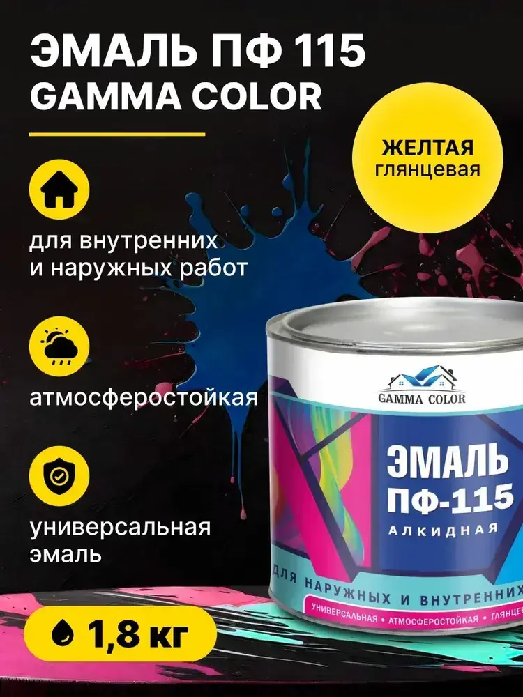 Эмаль алкидная желтая ПФ 115 Gamma Color 1,8 кг/краска по металлу дереву бетону для наружных работ