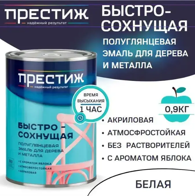 Эмаль для дерева и металла универсальная ПРЕСТИЖ акриловая, без резкого запаха, экологичная, полуглянцевая, БЕЛАЯ, 0,9кг
