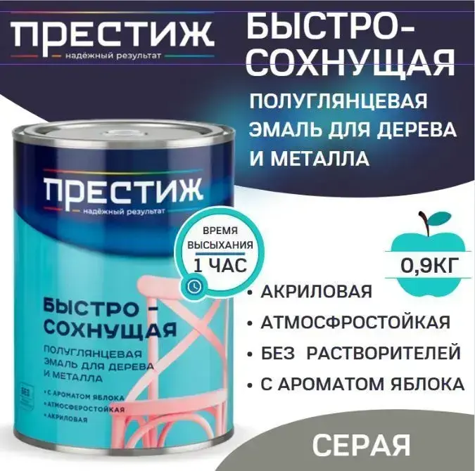 Эмаль для дерева и металла универсальная ПРЕСТИЖ акриловая, без резкого запаха, экологичная, полуглянцевая, СЕРАЯ, 0,9кг