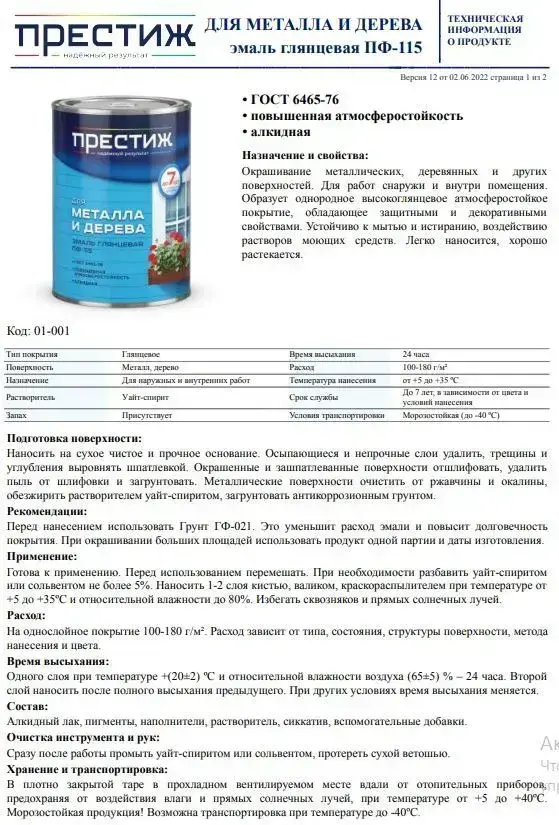 Эмаль для металла и дерева ПРЕСТИЖ ПФ-115, глянцевая, белая, 1,9кг