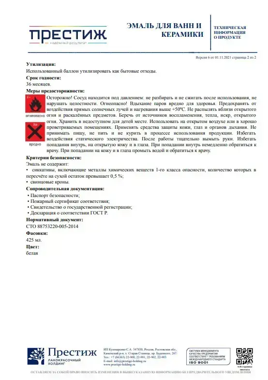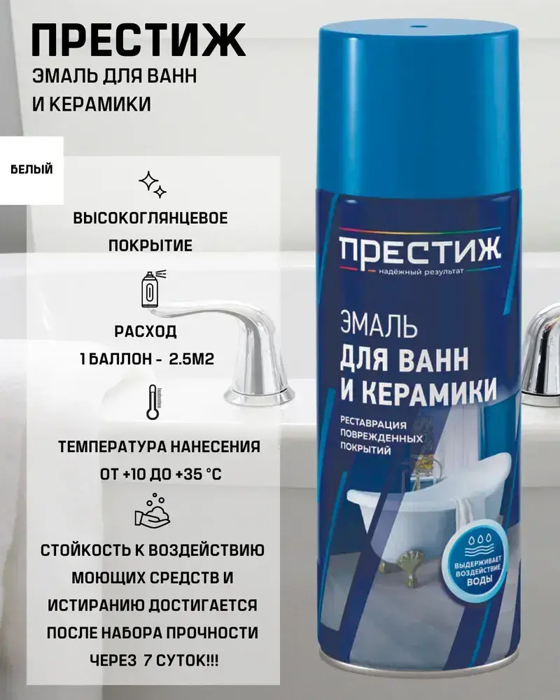 Эмаль для ванн и керамики ПРЕСТИЖ белая 425 мл