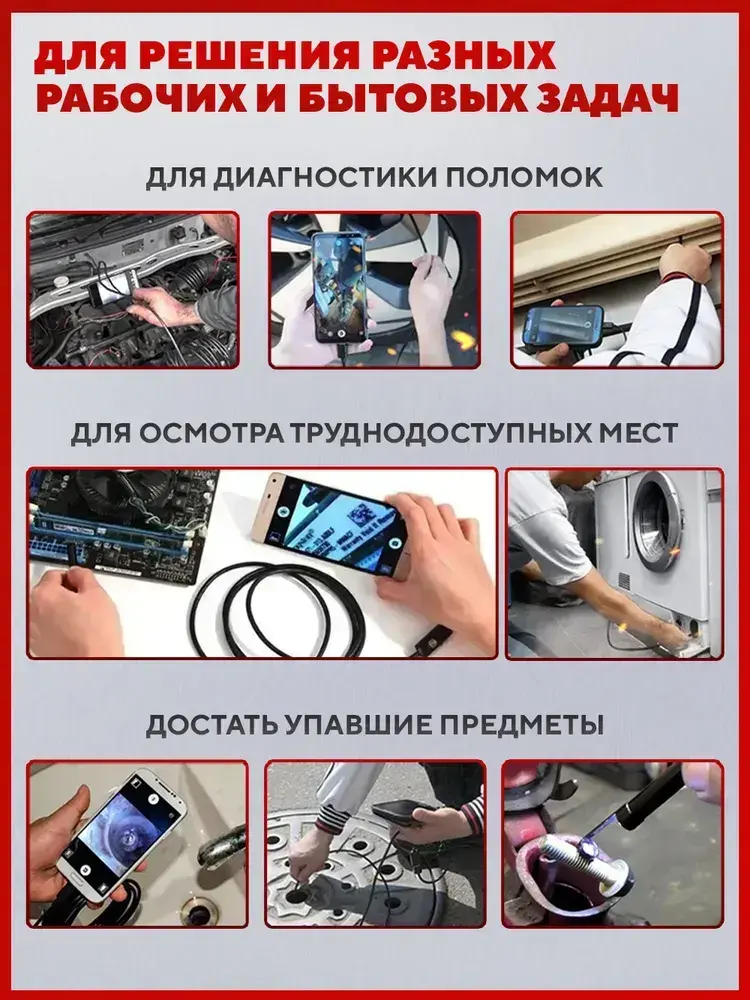 Эндоскоп автомобильный для смартфона, WiFi, 8 мм, 3.5 м, гибкий кабель, IP68, фото ивидео