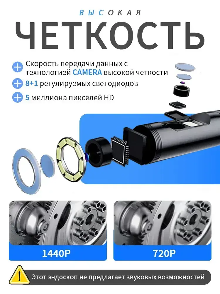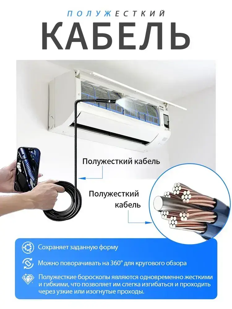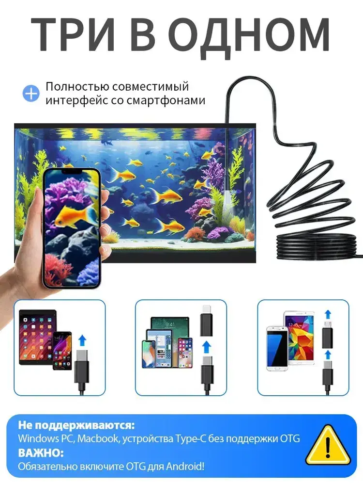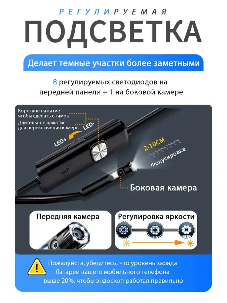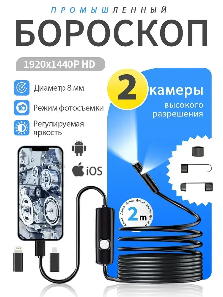 Эндоскоп для смартфона с подсветкой, 2 камеры, 3МП, 8мм, водонепроницаемый, Android/iOS, 2 метра, жесткий кабель