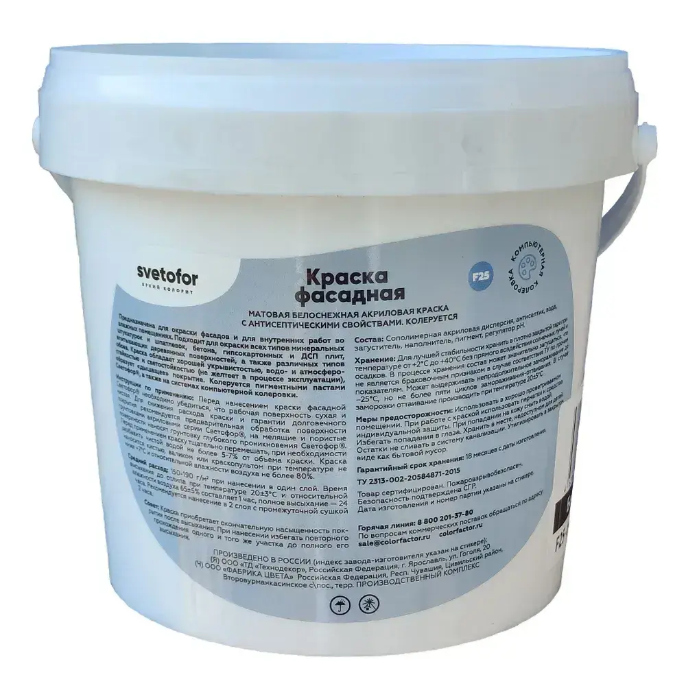 Фасадная краска для стен Svetofor F25 Белая 1,4 кг, моющаяся, для наружных и внутренних работ, матовая, водоэмульсионная, акриловая, без запаха растворителей