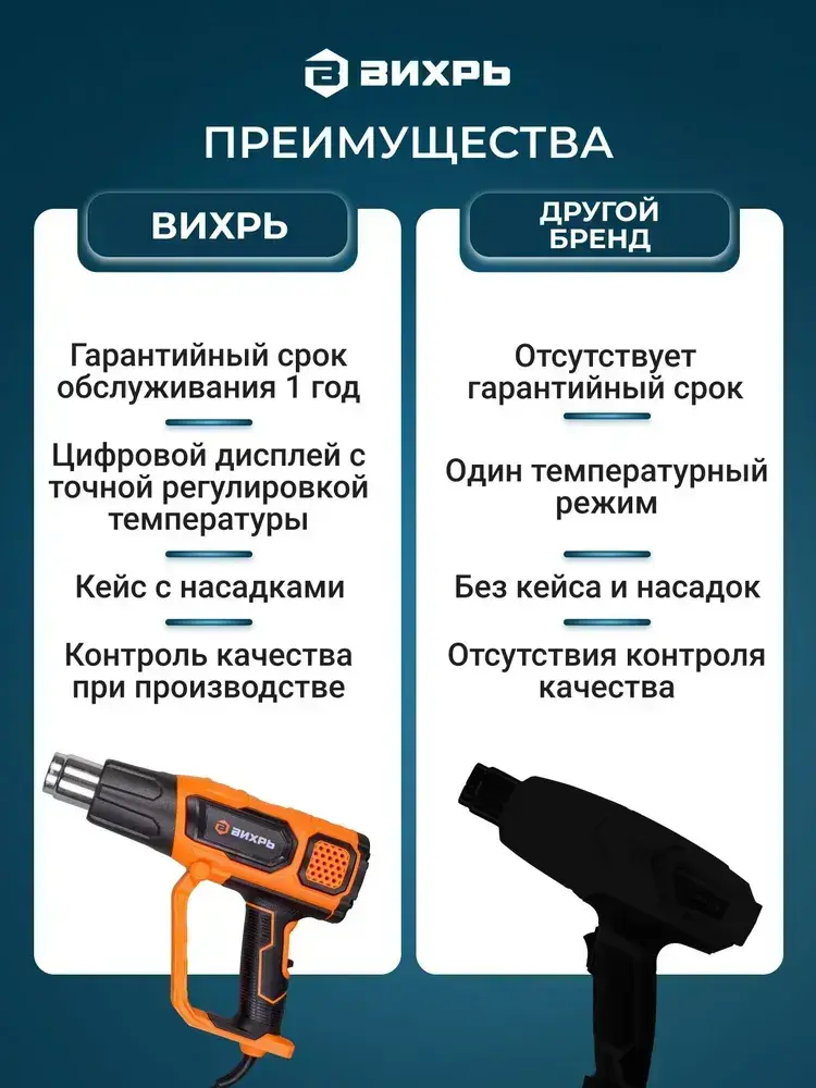 Фен строительный 2000Вт с регулировкой температуры ТП-А2.0 Вихрь, 2 режима, 350-550 градусов, с защитой от перегрева
