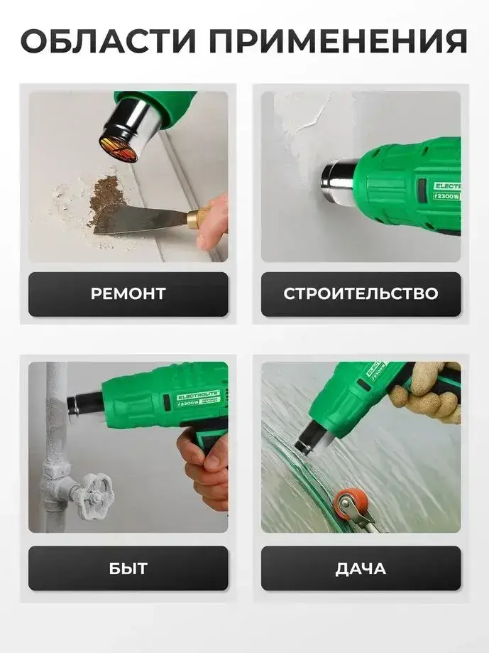 Фен строительный / технический ELECTROLITE Ф 2300 С НАБОРОМ ( 2300 Вт, 220 В, 400/600 С, 300/500 л/мин, резиновая рукоять )