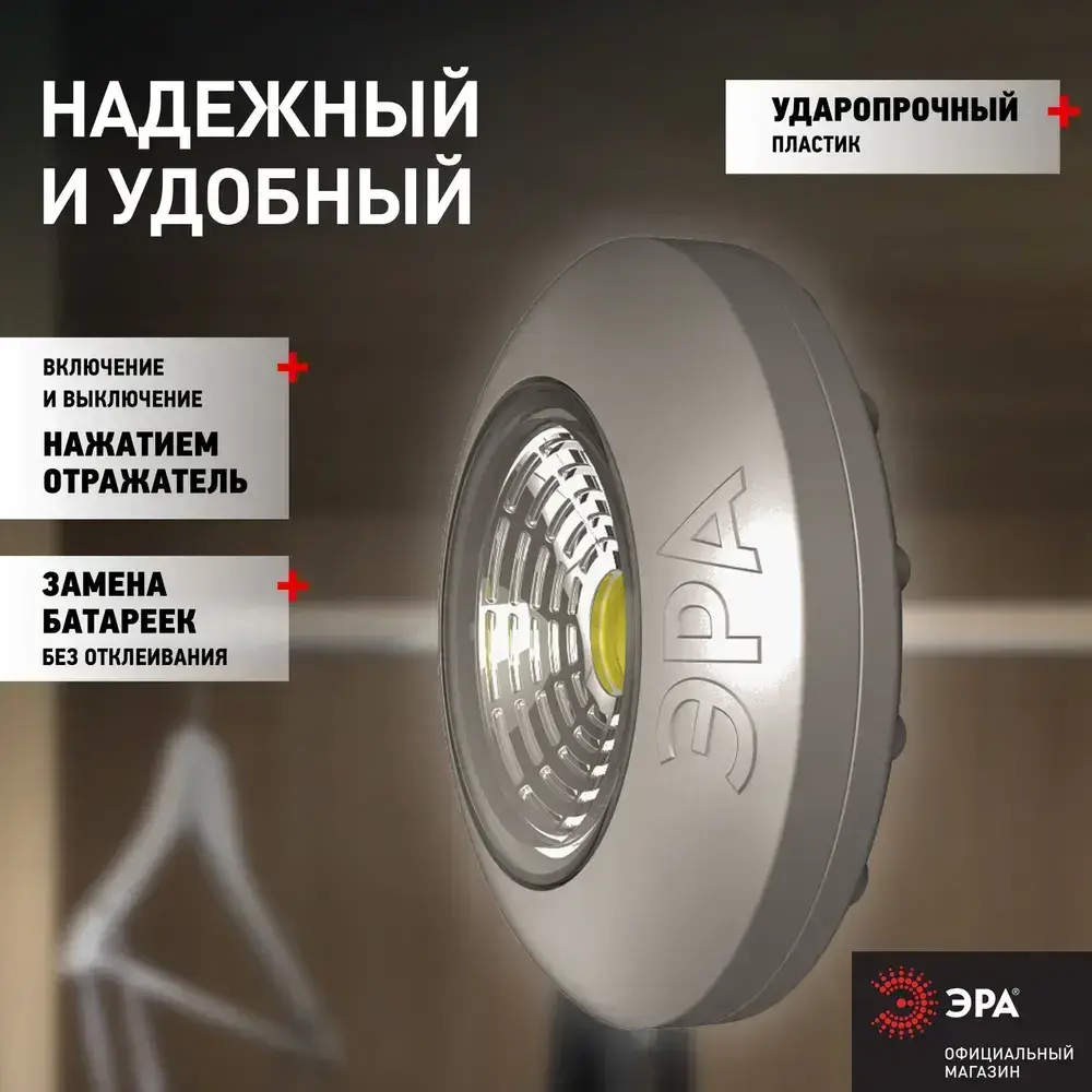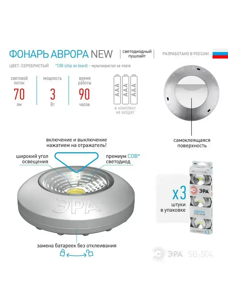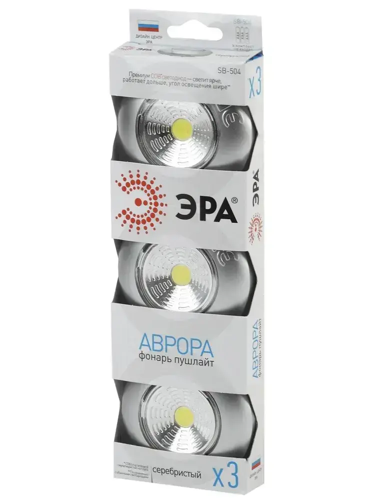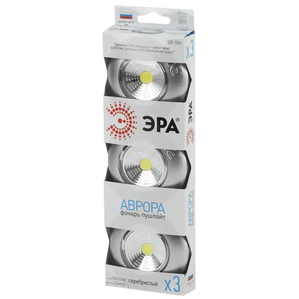 Фонарь светодиодный ЭРА SB-504 Аврора пушлайт мощный на липучке на батарейках, 3 штуки