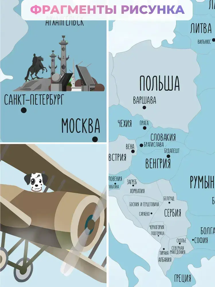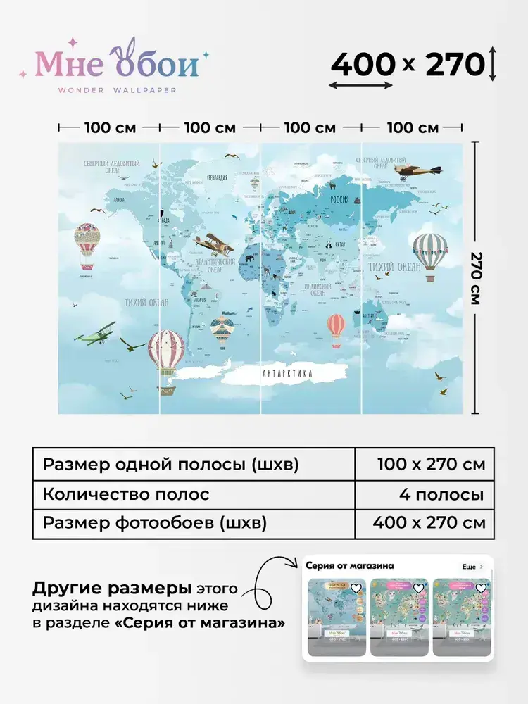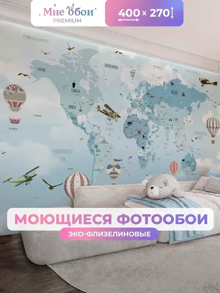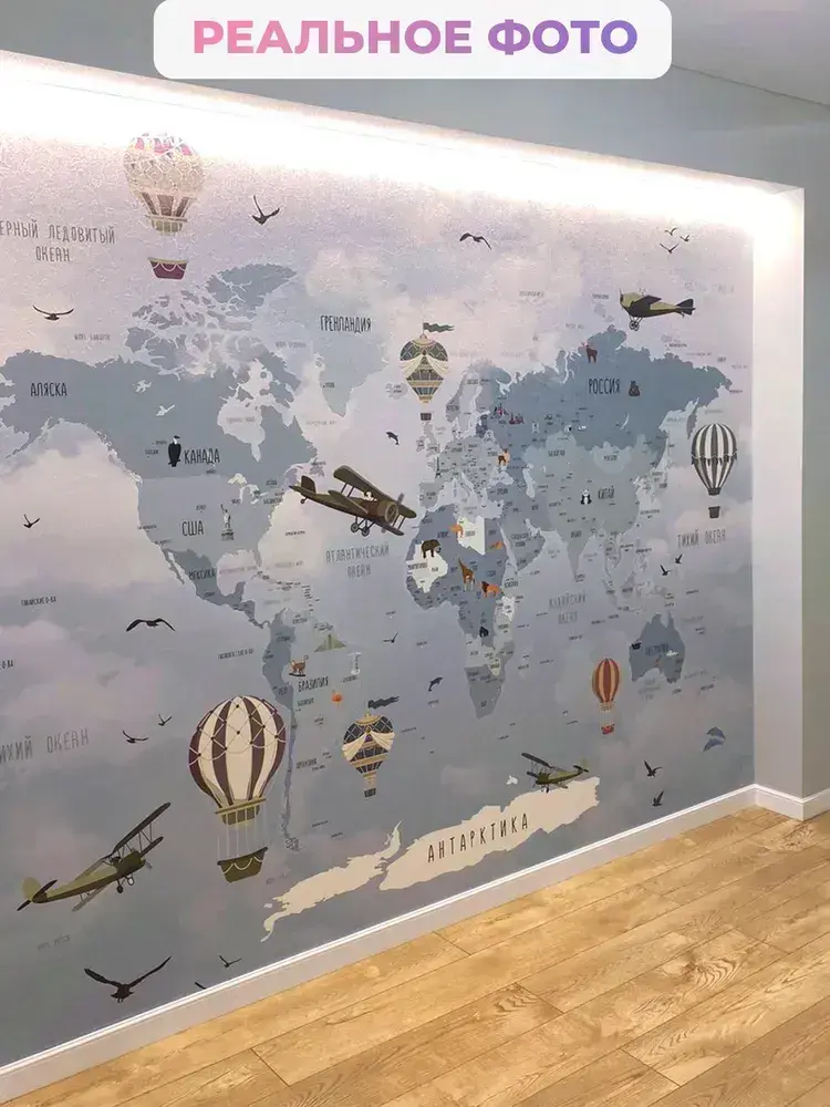 Фотообои детские флизелиновые на стену 3D "Карта мира с самолетами и шарами" 400х270 (ШхВ), 3д обои в детскую