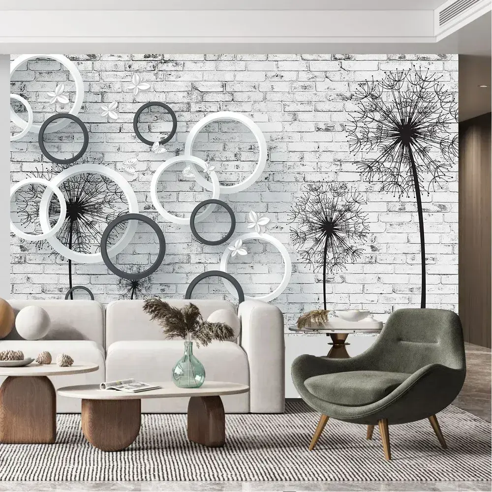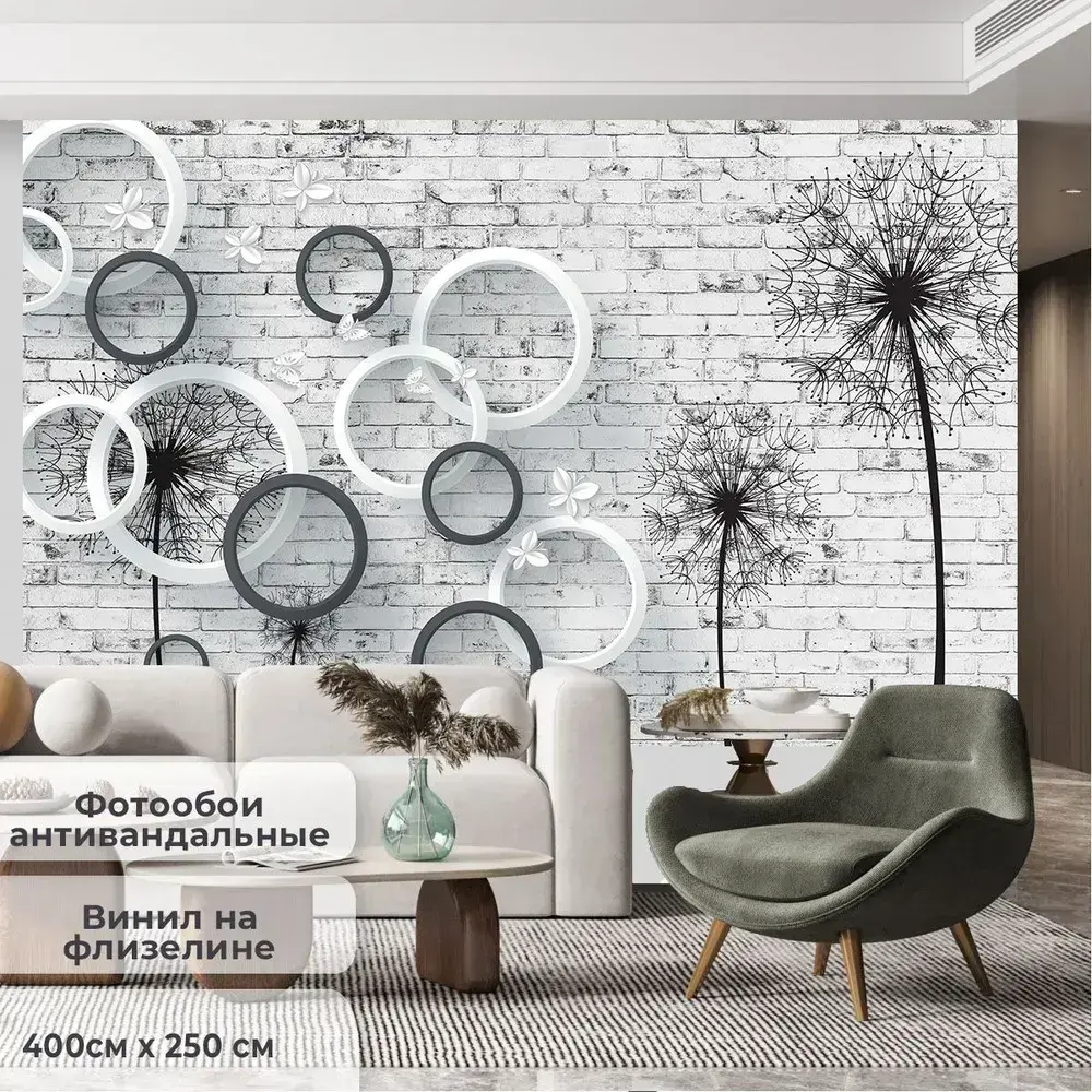 Фотообои на стену антивандальные 400х250см Одуванчики на кирпичной стене 3D винил на флизелине зеркальные