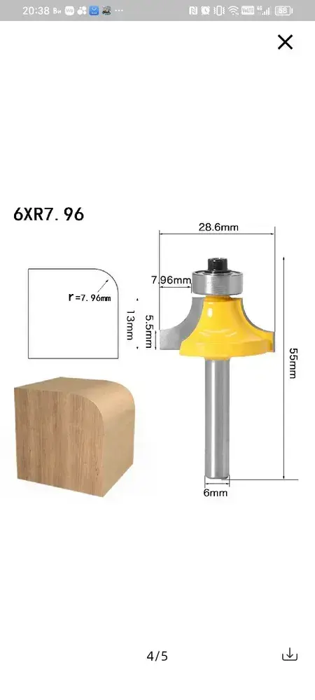 Фреза кромочная (калевочная) с нижним подшипником R 7,96 мм, хвостовик 6 мм.