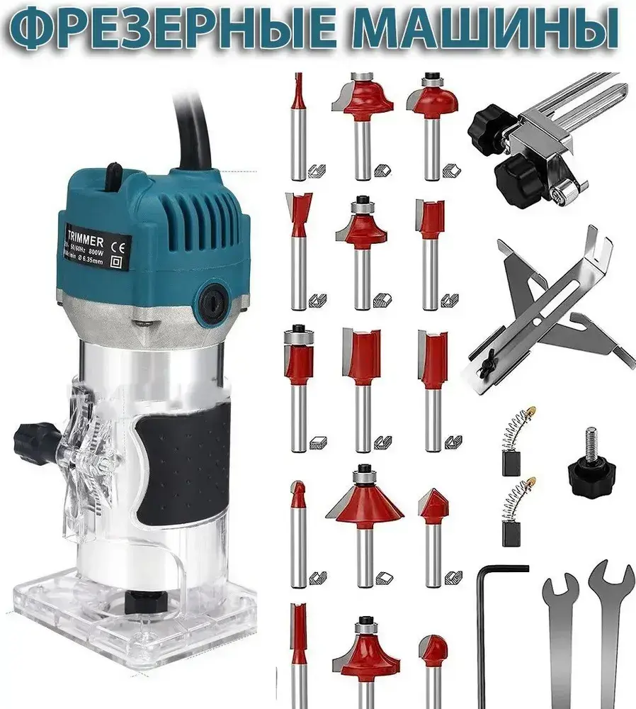 Фрезер по дереву электрический , набор фрез 15 шт,30000 об/мин,цанга 6.35мм800 Вт