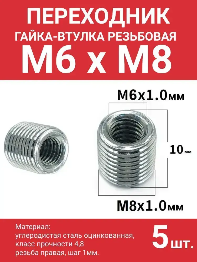 Гайка втулка резьбовая переходник м6 на м8, втулка с наружной резьбой М8 и внутренней М6, высота 10 мм, 5 шт.