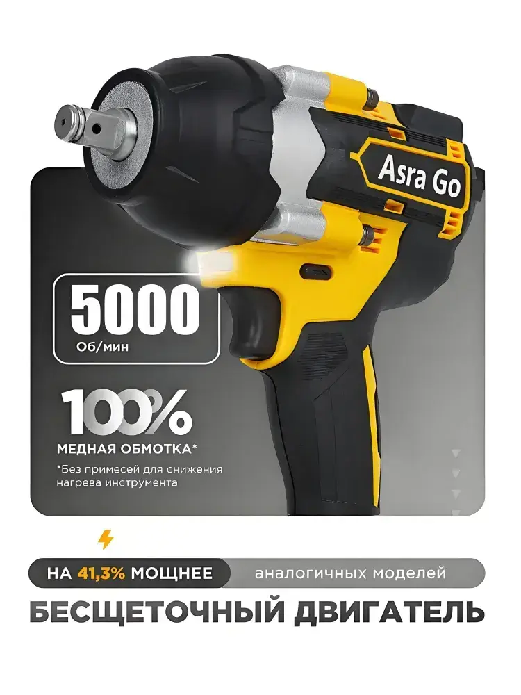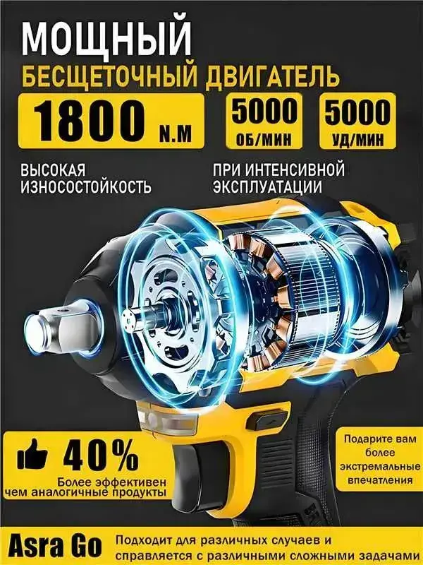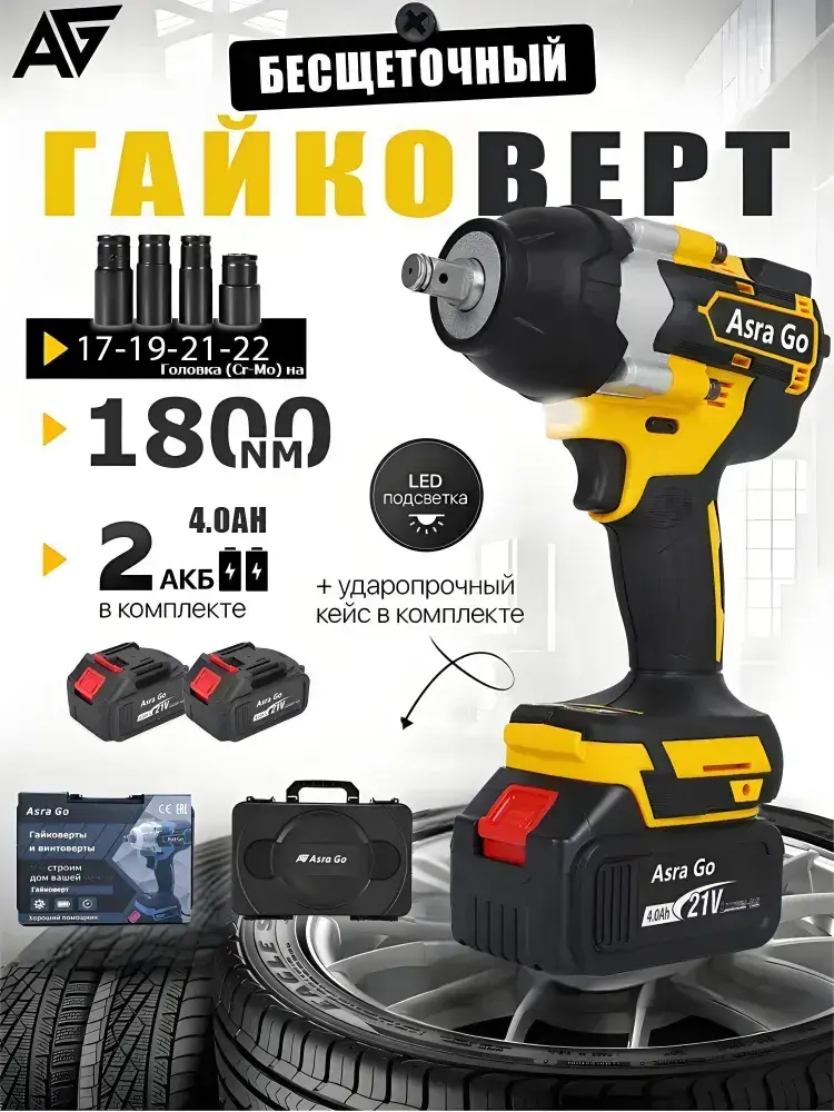 гайковерт аккумуляторный ударный бесщеточный,1800 НМ,Asra Go,2 АКБ