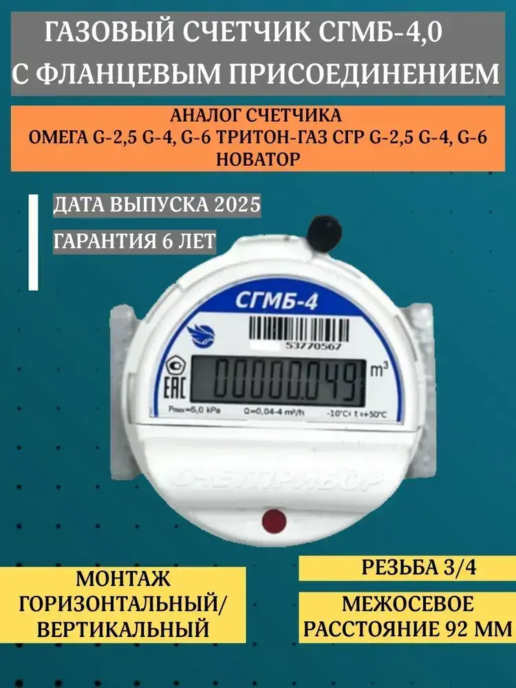 Газовый счетчик СГМБ-4 С ФЛАНЦЕВЫМ СОЕДИНЕНИЕМ 2025 г. левый правый, Омега G4, ТРИТОН-ГАЗ, СГР G-4,Омега G4