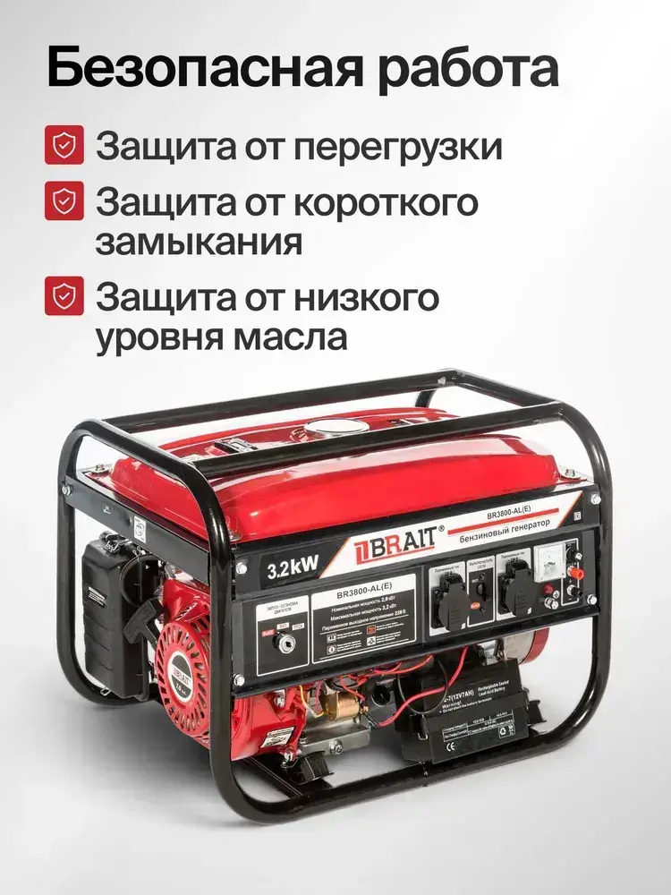 Генератор бензиновый BRAIT BR3800-AL(Е) (2,9/3,2кВт,220В,50Гц,12В) / бензогенератор / резервный источник питания