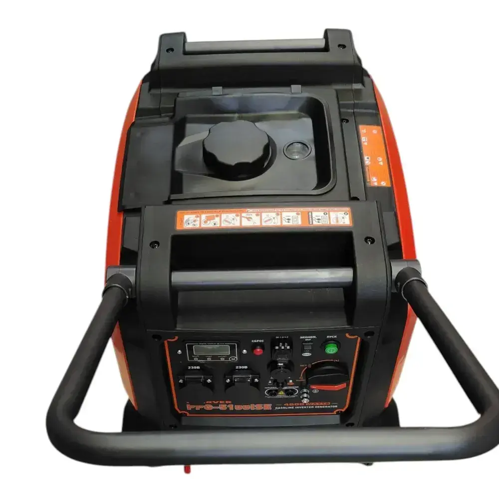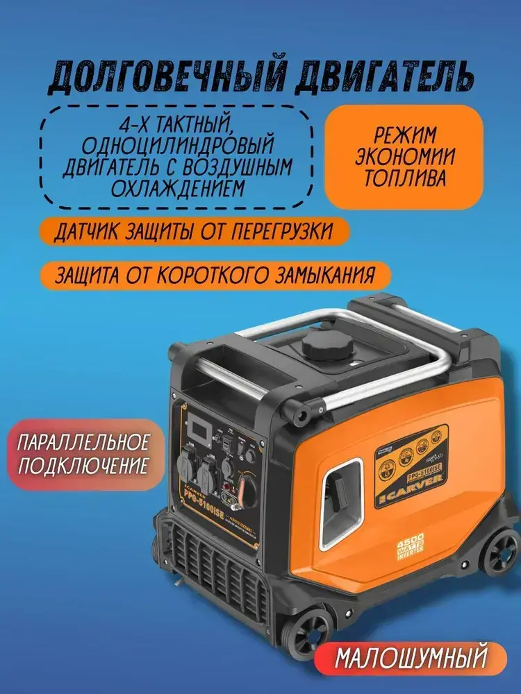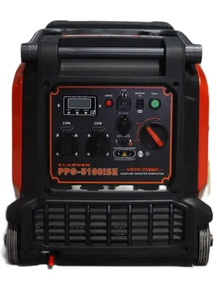 Генератор бензиновый Carver PPG-5100ISE инверторный (4.5 кВт, 230В, бак 11л, двигатель 236 куб.см, электростартер, DOUBLE USB QC 2.0. 3.0, дисплей, рукоятки + колеса) / бензогенератор / электростанция