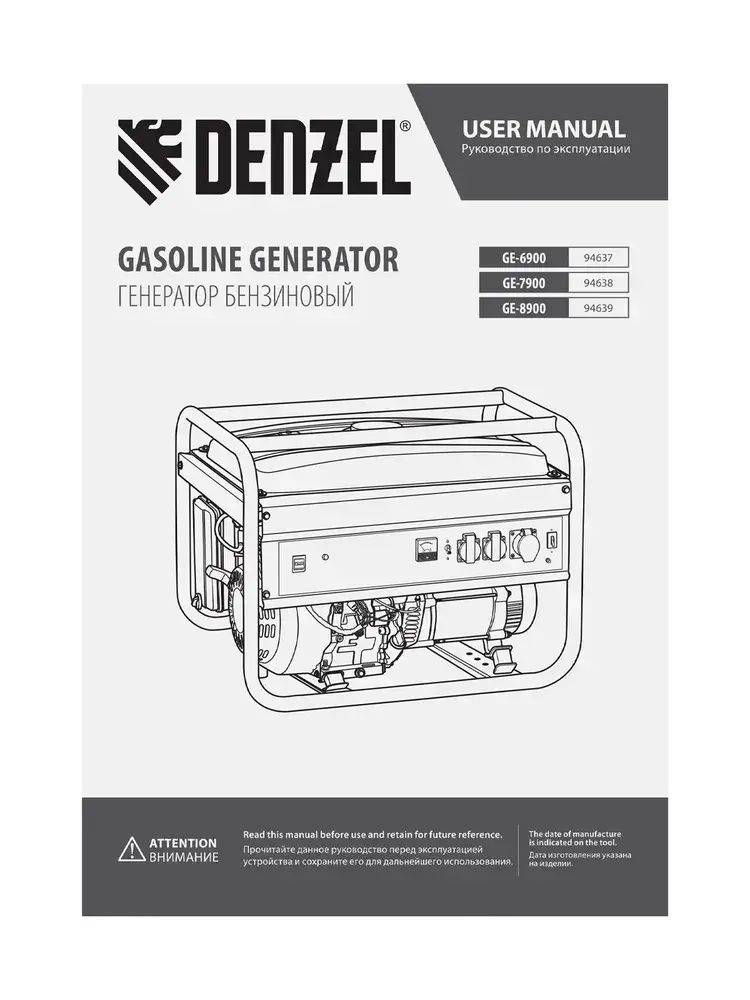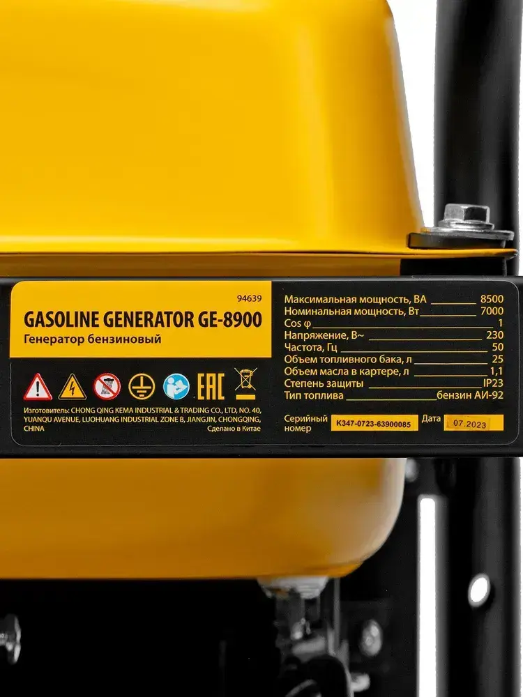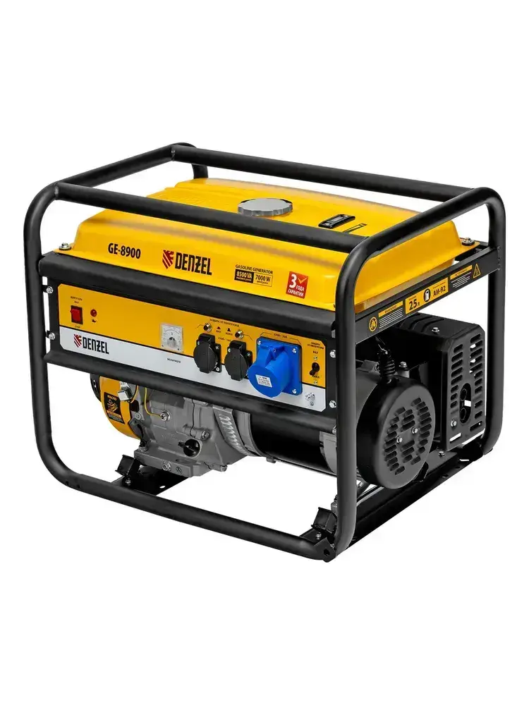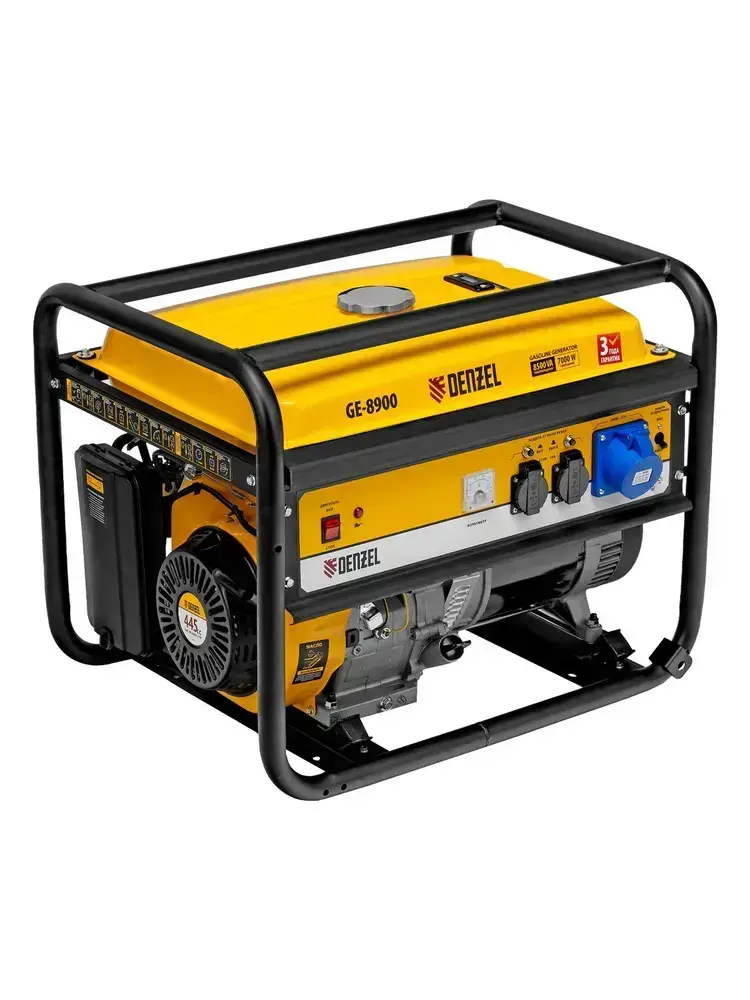 Генератор бензиновый DENZEL GE-8900, 8.5 кВт, 445 см3 объем двигателя, 220 В и 25 л объем топливного бака, ручной стартер и блок AVR, 3 розетки и датчик уровня масла 94639