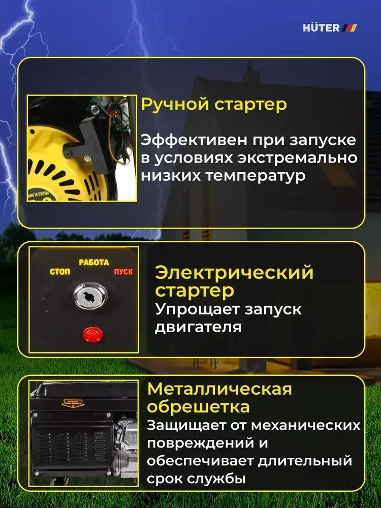 Генератор бензиновый Huter 5.5кВт, электростартер/ручной, 2 розетки, 13л.с., 6.8 кВА, 4х тактный двигатель