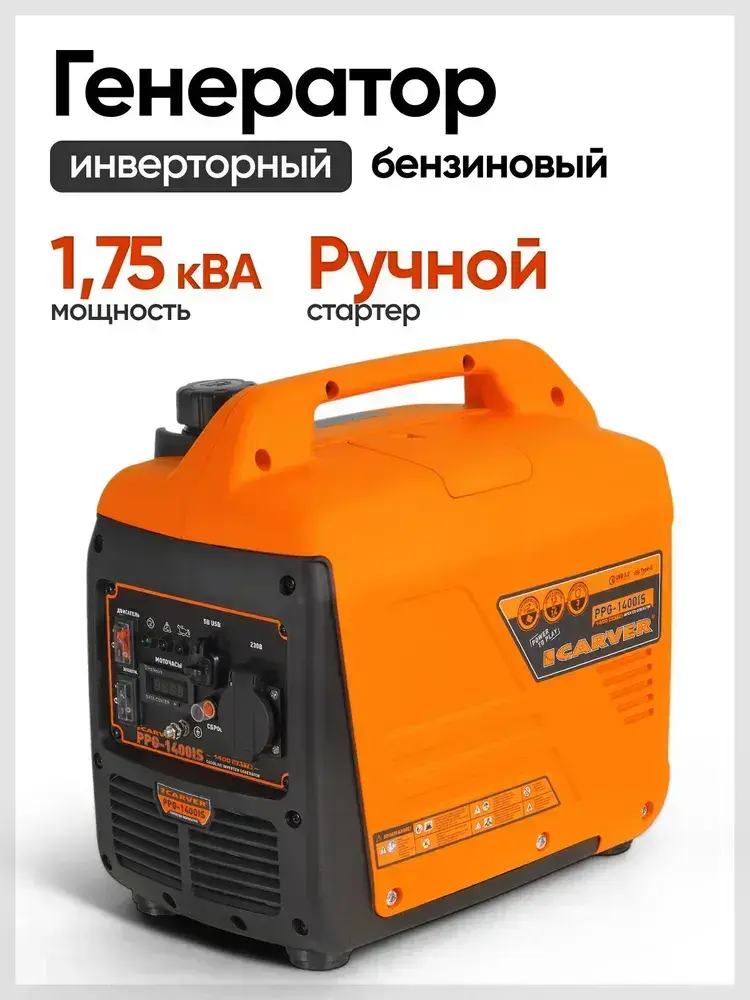Генератор бензиновый инверторный CARVER PPG -1400IS (1,4 кВт, бак 2,5 л, ручной стартер, цифровой дисплей, порт USB 3.0, Type-C) / бензогенератор / резервный источник питания