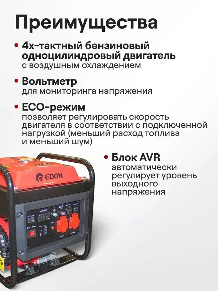 Генератор бензиновый инверторный EDON PT-3800 (3.2 кВт, 2 розетки, ручной запуск, бак 8 л, счетчик моточасов, USB, выход 12В, медная обмотка) / бензогенератор / резервный источник питания
