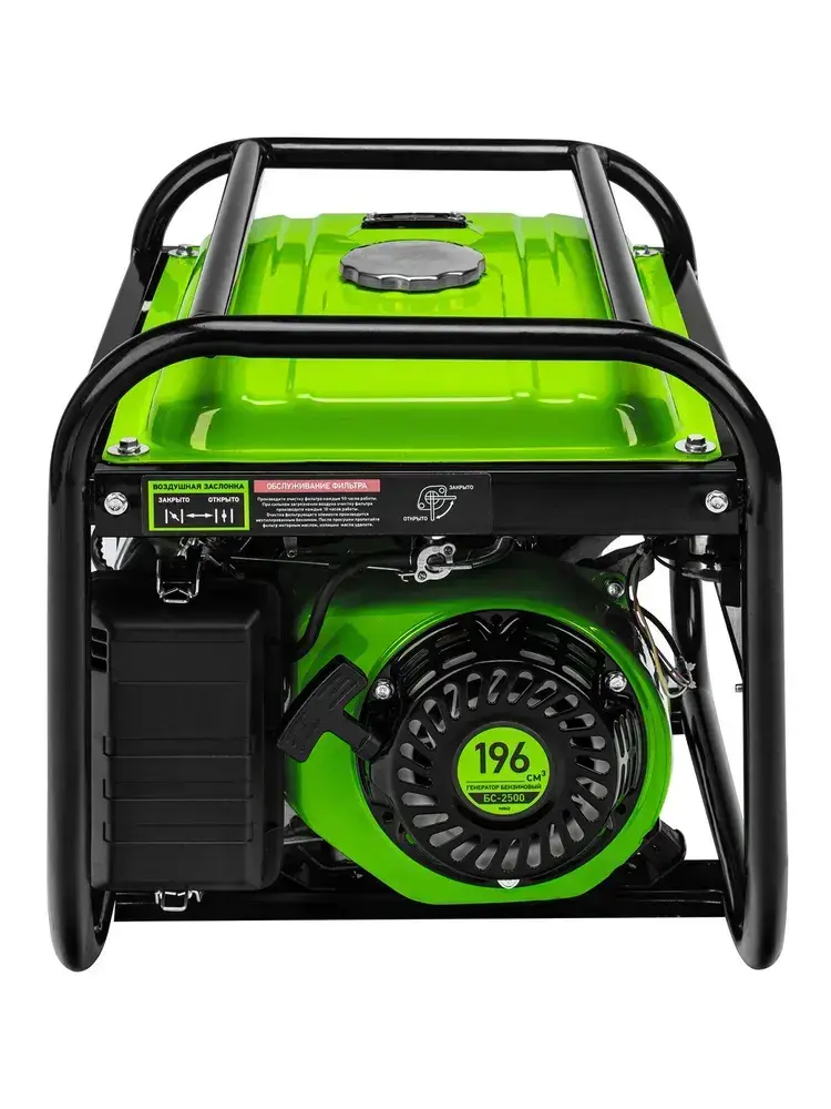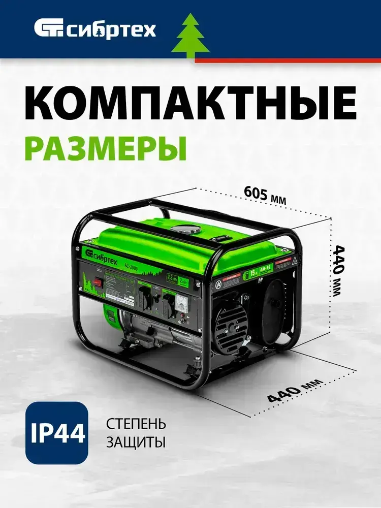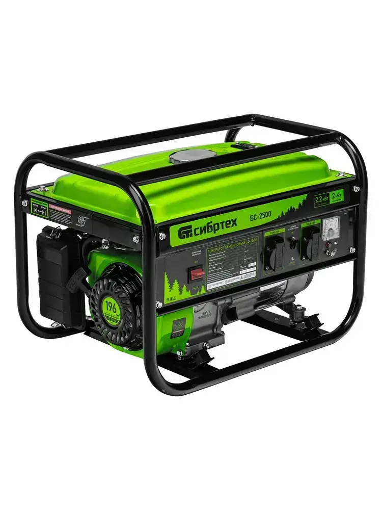 Генератор бензиновый СИБРТЕХ БС-2500, 2.2 кВт мощность и 196 см3 объем двигателя, 15 л объем топливного бака, ручной стартер, блок AVR, 2 розетки и датчик уровня масла, 94542