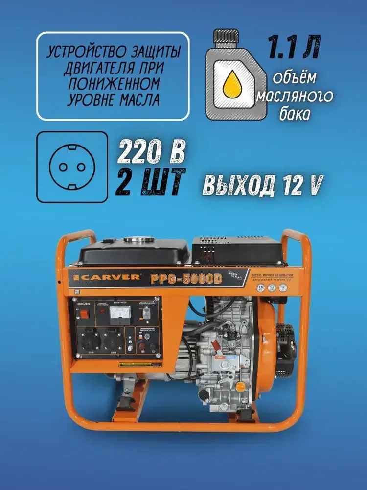 Генератор дизельный CARVER PPG - 5000D (LT-178F, 3,3/3,6 кВт, 220В, бак 12.5л, медь) Бензогенератор / резервное питание