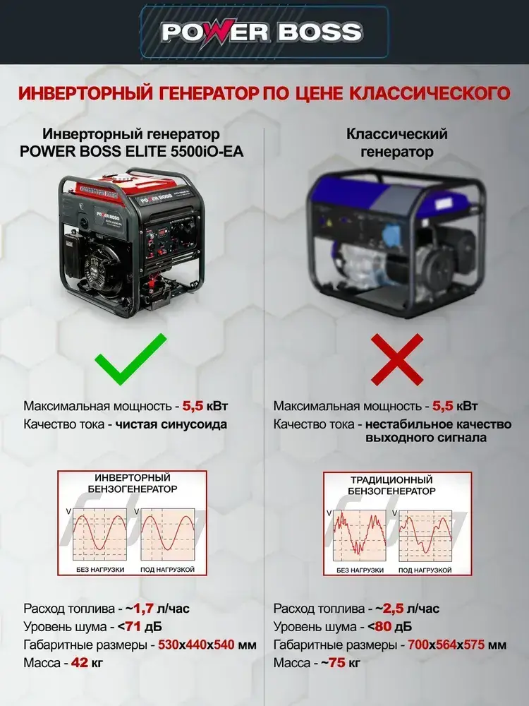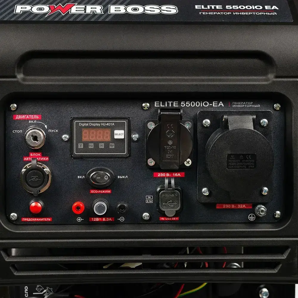 Генератор Инверторный Power Boss ELITE 5500iO-EA, 5.5 кВт 236 см3, 15 л, электростарт AVR коннектор автоматики, розетки 1х230 В/16 А и 1х230 В/32 А, выход постоянного тока USB 5 В, 102004