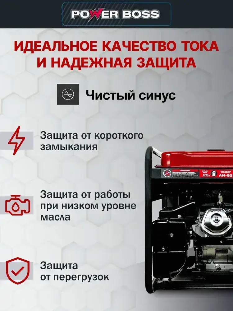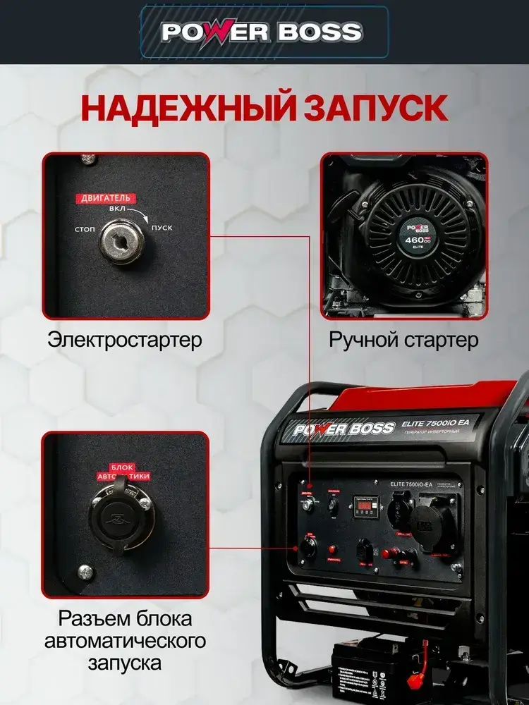 Генератор Инверторный Power Boss ELITE 7500iO-EA 7.5 кВт 460 см3, 25 л, электростарт AVR коннектор автоматики, розетки 1х230 В/16 А и 1х230 В/32 А выход постоянного тока USB 5В, силовые клеммы, 102005