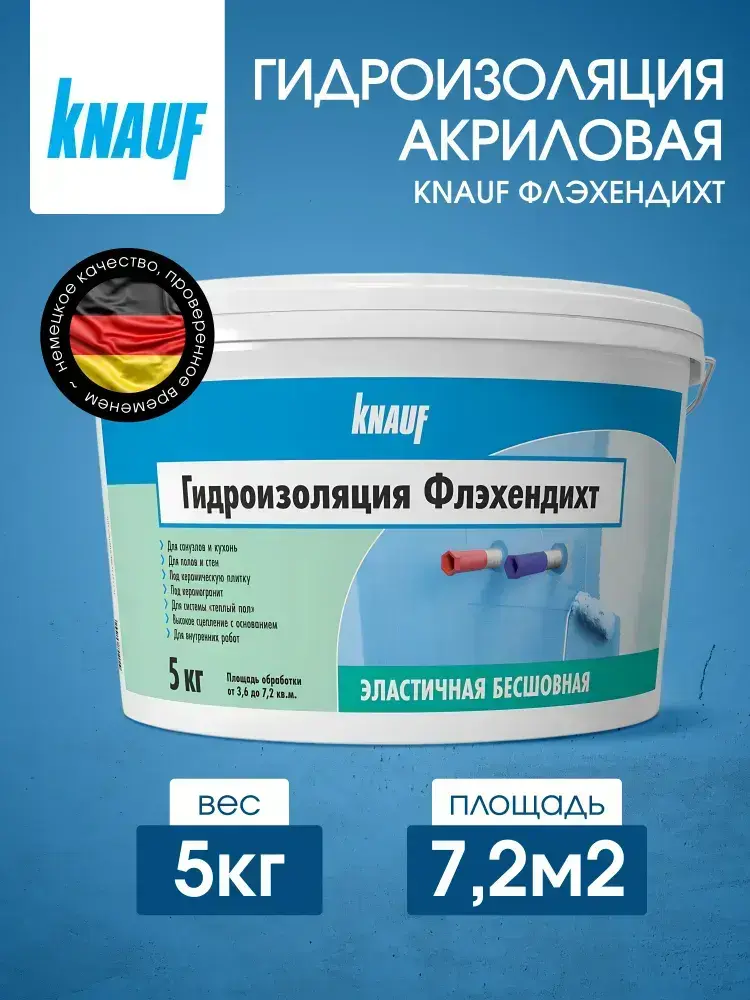 Гидроизоляция акриловая КНАУФ Флэхендихт мастика 5кг. Для ванны и для душевой под плитку, кухни, пола, влажных помещений. Жидкая.