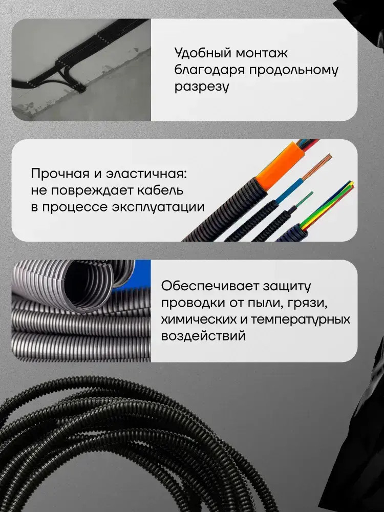 Гофра для укладки проводов разрезная, внутренний диаметр 10 мм, длина 10 метров. Без протяжки. Гофра Сэппра