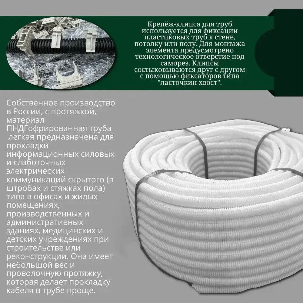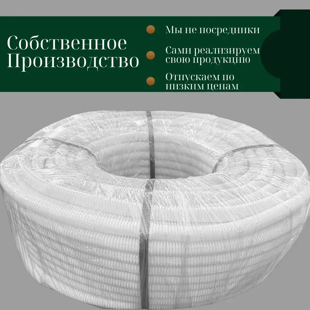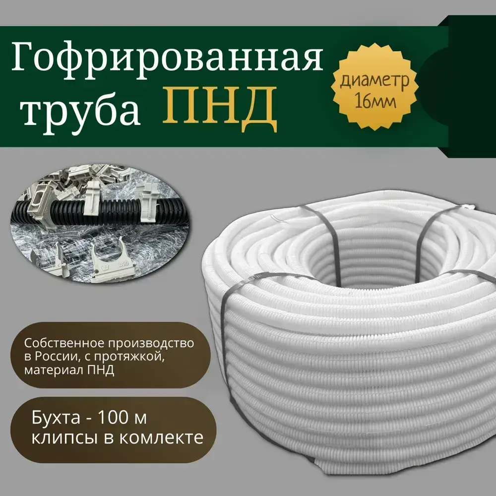 Гофра ПНД 16 мм труба гофрированная с зонтом белая для кабеля 100м (клипсы в комплекте 100 шт)
