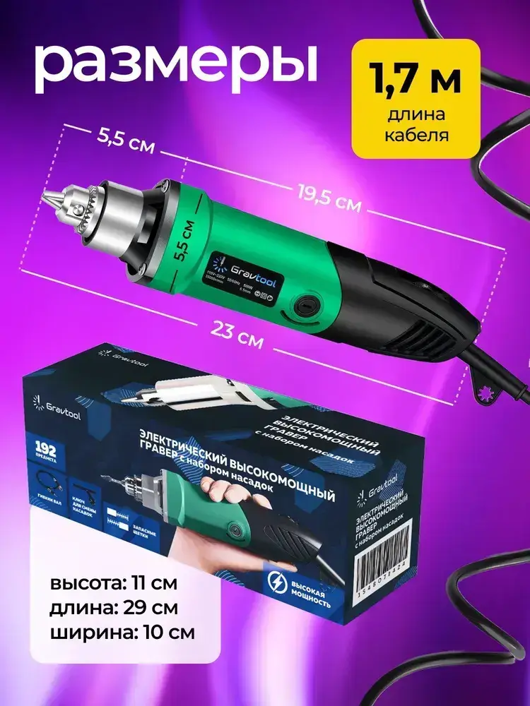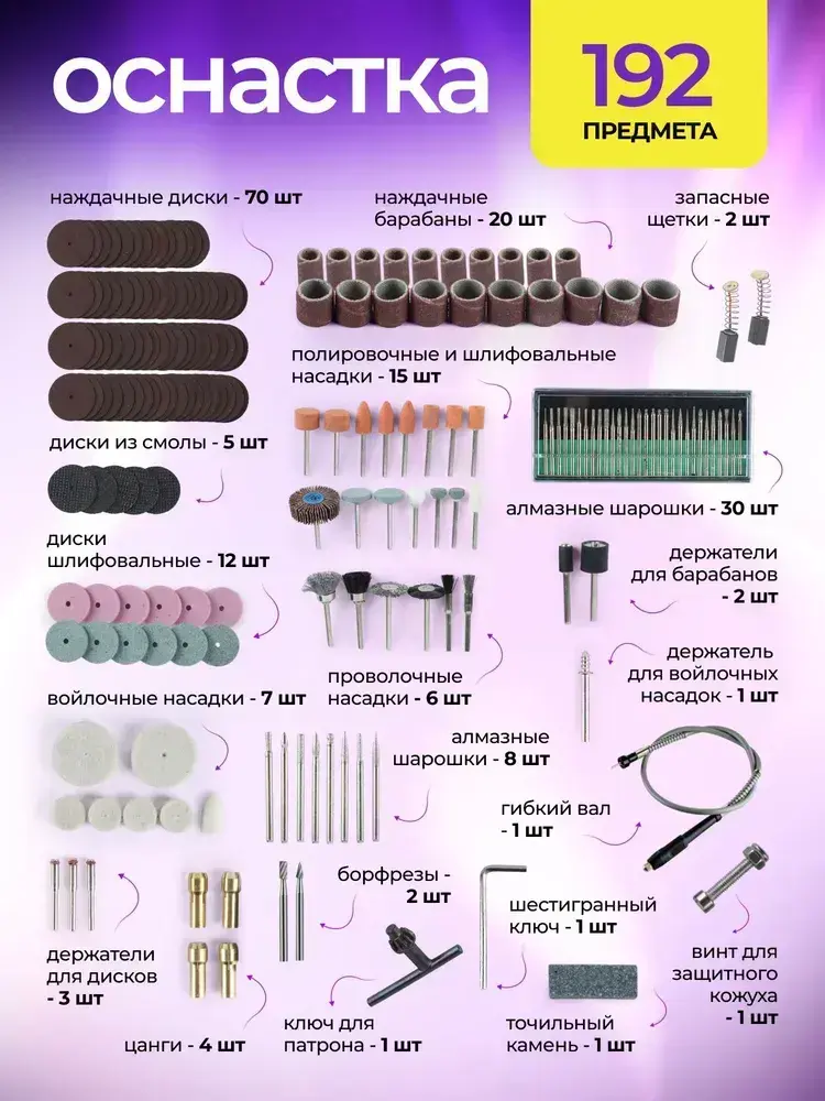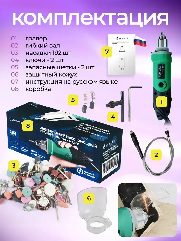 Гравер электрический 500 ВТ с насадками 192 шт. и гибким валом, 35000 об/мин / Бор машинка электрическая / Мини дрель