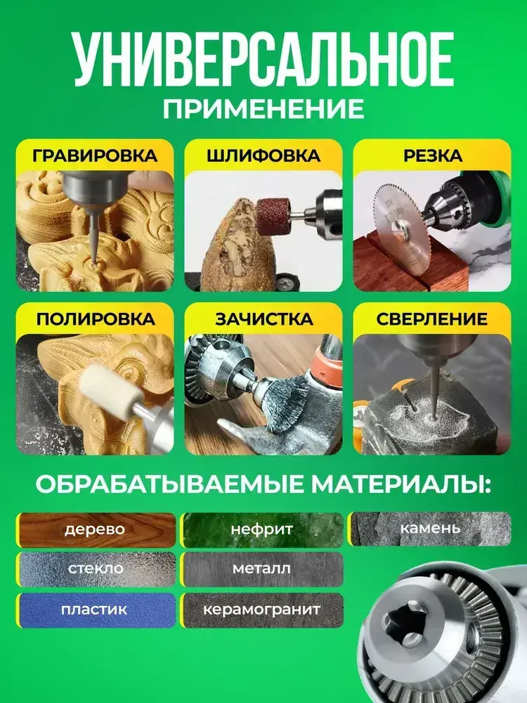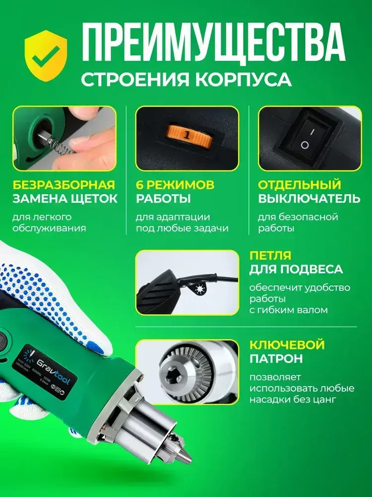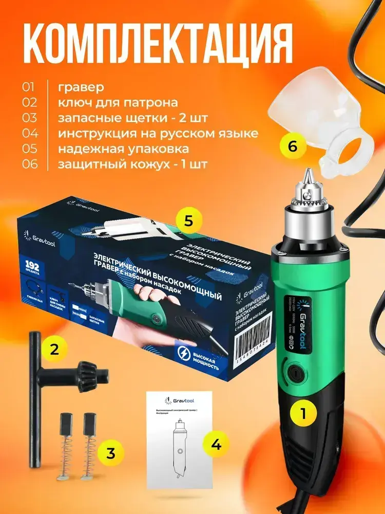 Гравер электрический мощный 500 ВТ, 35000 об/мин, с ключевым патроном 0.5-6 мм / Бор машинка электрическая / Мини дрель